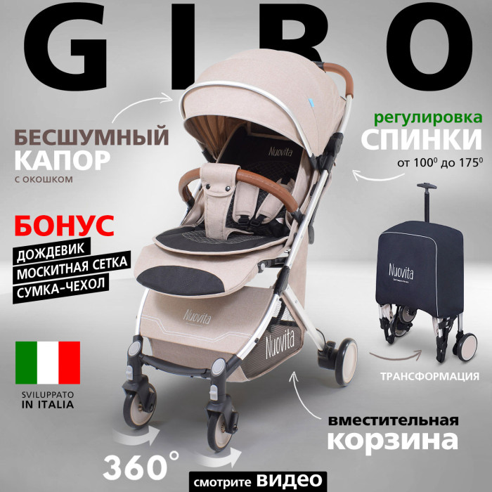 Коляска Nuovita Giro (нуовита гиро) - прекрасный вариант легкой и стильной коляски на теплое время года. Настоящая находка для путешествий и поездок в гости. Ведь в этой коляске предусмотрено не только компактное сложение и сумка-чехол для транспортировки, но и телескопическая ручка для удобной перевозки коляски в сложенном виде. Еще ни когда ваша поездка не была такой легкой и удобной.