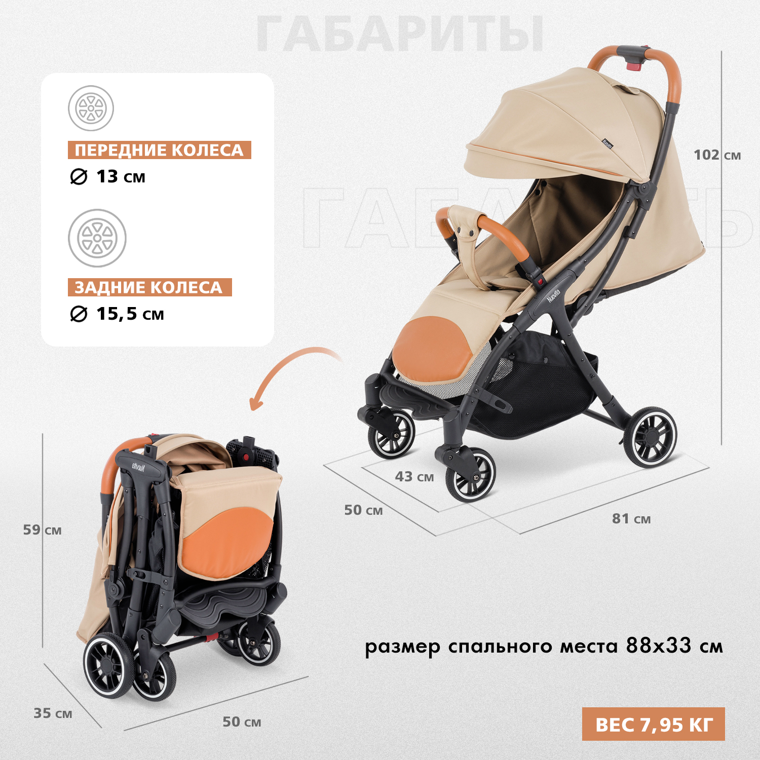 - Диаметр/ширина передних колес: Ø 13/ 2,5 см