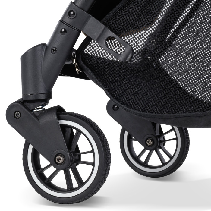 Отдельно хочется отметить проходимость коляски по любым дорогам и тропинкам. Не смотря на свой вес и небольшие полиуретановые колеса, у коляски мягкий ход и удобное управление. Амортизация на всех четырех колесах позволяет сглаживать неровности дороги. А передние поворотные колеса с системой анти-шок помогут легко маневрировать среди ям и неровностей.
