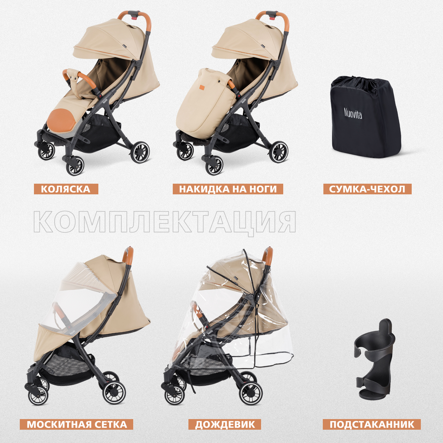 - Комплектация: коляска, накидка на ноги, плащь-дождевик, москитная сетка, подстаканник, сумка-чехол.