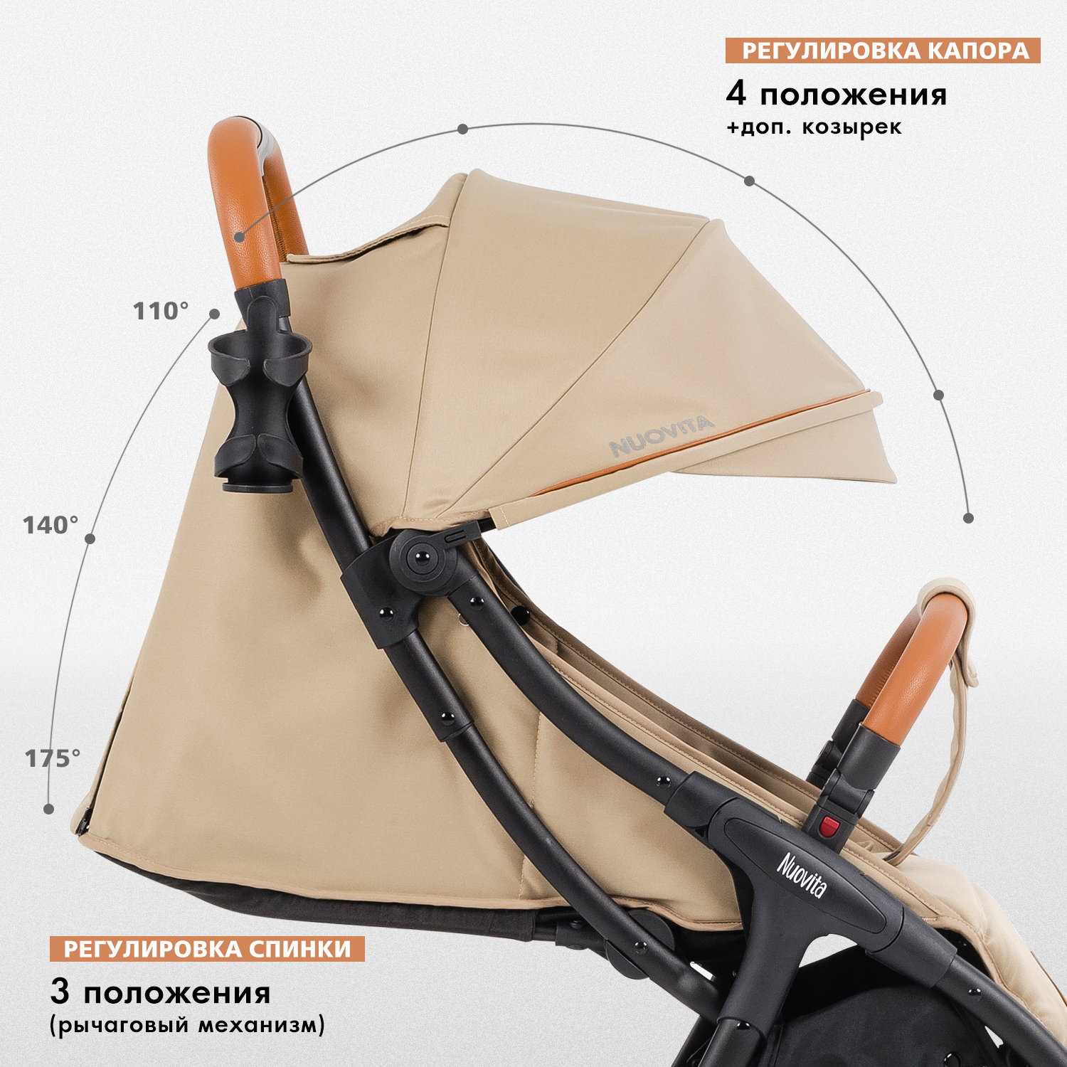 - Капор с 4 регулировками и дополнительным козырьком от солнца.