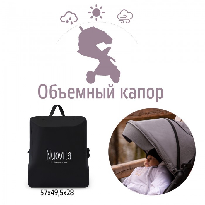 Прогулочная коляска Nuovita Sfera (нуовита сфера) - красивая и функциональная коляска для ребенка от 6 месяцев. Модель выполнена из красивой и качественной ткани эко -лен. Она удобная в эксплуатации, защищает от УФ лучей и имеет влагоотталкивающий эффект. У модели хорошие внутренние размеры. Она комфортная и вместительная. Для прохладной погоды есть утепленная накидка на ножки. Большой капюшон так же надежно закроет ребенка от любой непогоды, а в летнее время года предусмотрено несколько вентиляционных окошек на капюшоне. У модели есть все необходимые аксессуары в комплекте, что позволит не искать удобный дождевик или москитную сетку отдельно. У данной модели компактные размеры в сложенном виде и ее удобно переносить с помощью специальной ручки на раме.