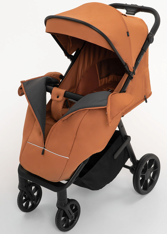 Обивка из плотной непромокаемой ткани в два слоя, глубокий капюшон и теплая накидка на ноги защитят от ветра и холода. Большое спальное место позволяет с комфортом разместить ребенка в теплой объёмной одежде. Большие колеса с амортизацией и фиксацией передних колес в положении «прямо» проедут по неглубокому снегу.