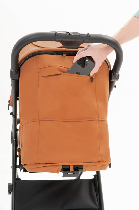 - Ручка из экокожи и регулируется по высоте в 5 положениях. На ней расположена кнопка складывания и защитные ножки, на которых стоит коляска в сложенном виде. При этом сама ручка не касается земли и остается чистой;