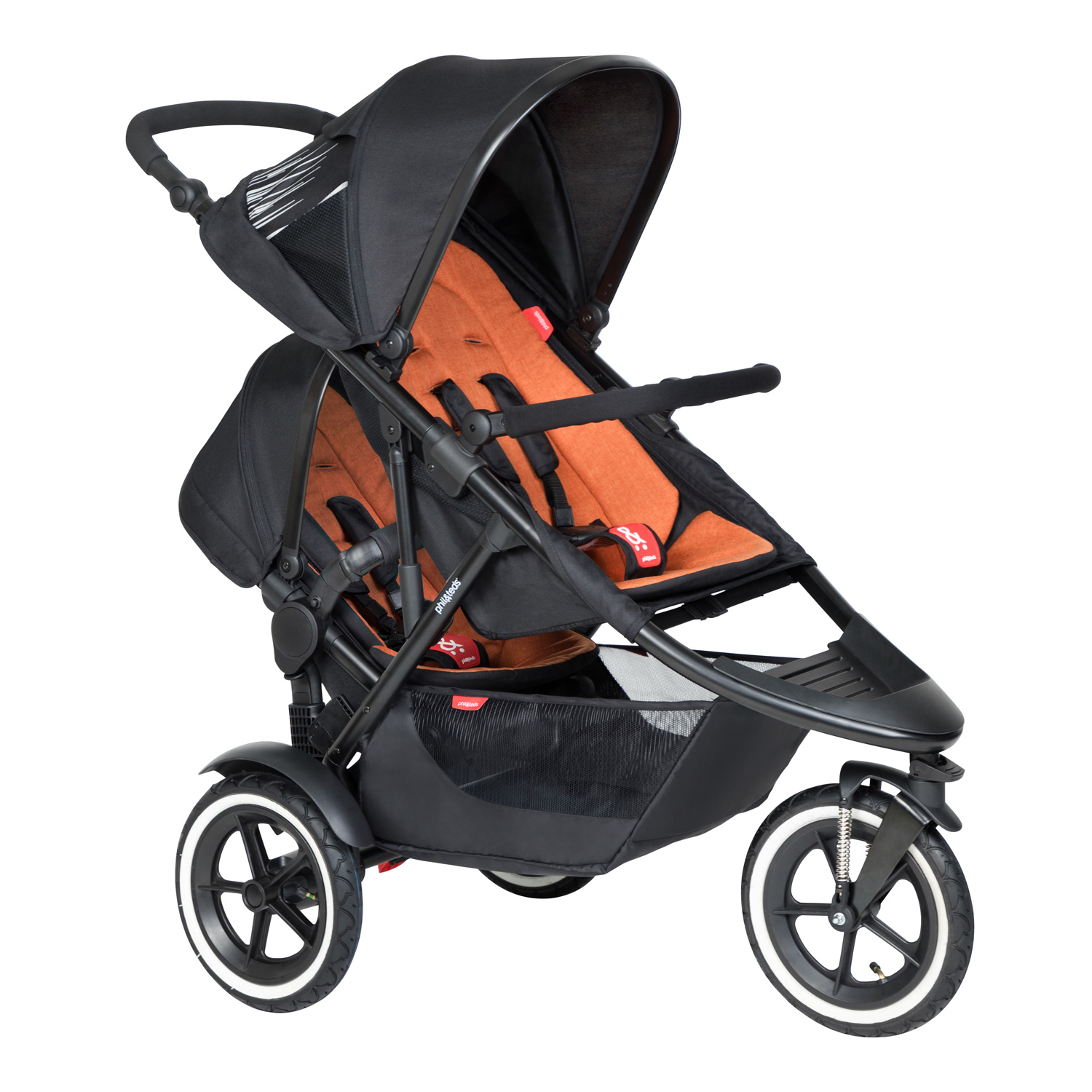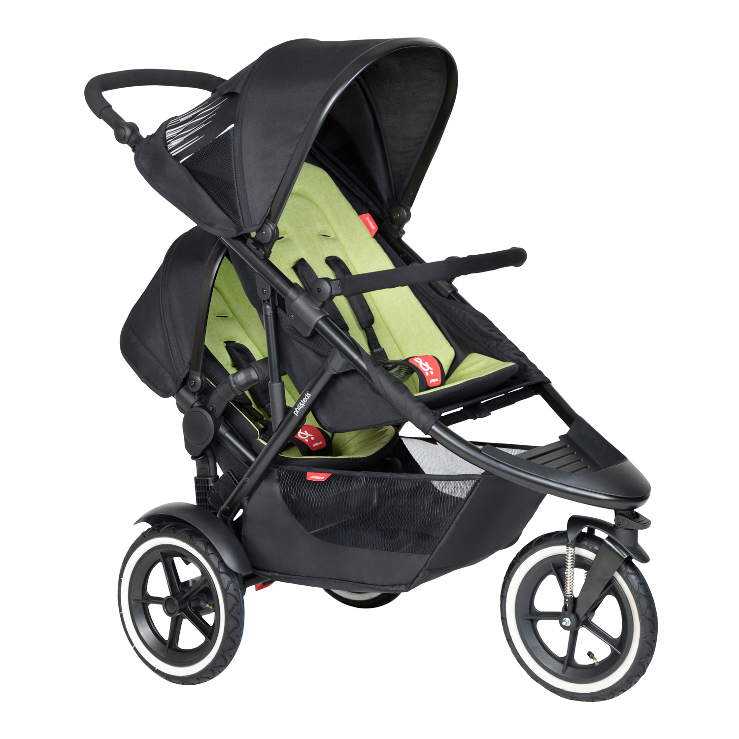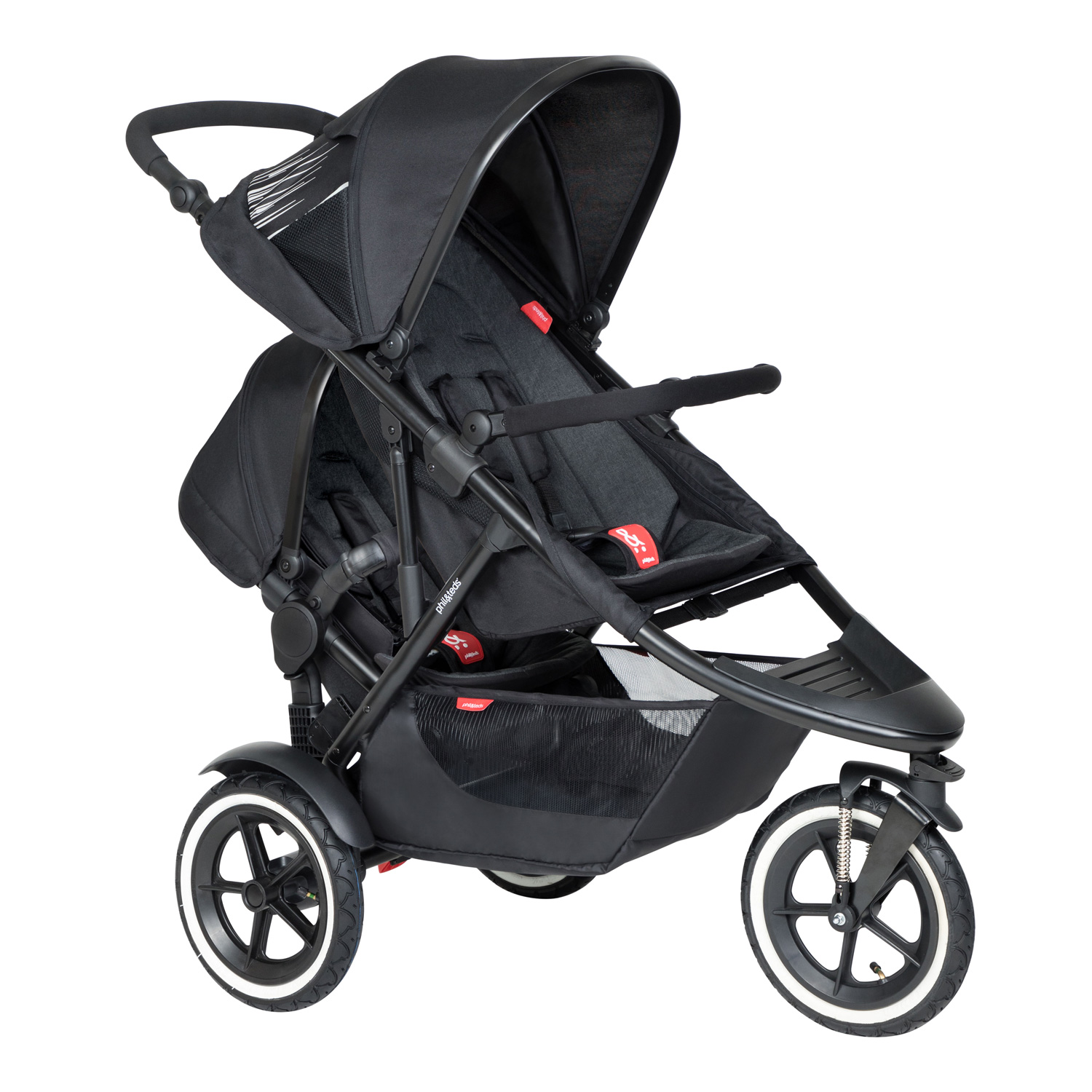 Коляска для двойни и погодок Phil and Teds Sport (Коляска Фил энд Тедс Спорт) - уникальная коляска для двоих детей погодок, которая подарит вам маневренность, легкую управляемость и мобильность с двумя детьми. Это настоящий внедорожник от новозеландской компании Фил энд Тедс – специалиста в колясках для погодок, поэтому у вас будет надежный транспорт проверенный временем, который не подведет. У модели узкое шасси шириной 58 см. на которое устанавливается два сидения для детей. Одно сидение основное, с полностью горизонтальной спинкой, которое можно использовать даже для ребенка с рождения. Второе сидение в зависимости от необходимости можно установить в двух положениях (смотрите видео). У каждого блока просторное сидение, надежные ремни безопасности, капюшоны, и наклон спинки для комфортного отдыха во время прогулки. Три больших надувных колеса с дополнительной пружинной амортизацией обеспечивают отличной проходимость в лесу, на пляже или в заснеженном парке, смягчая неровности покрытия для комфортных прогулок и сна детей. Уникальная геометрия рамы, позволяет коляске быть одинаково маневренной и компактной, как с одним, так и с двумя детьми.