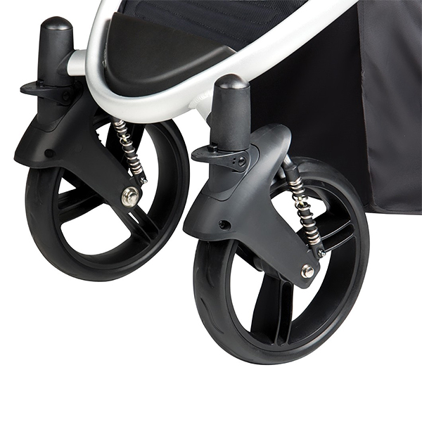 Передние колеса подрессоренные ненадувные, фиксируемые, диаметром 24 см;