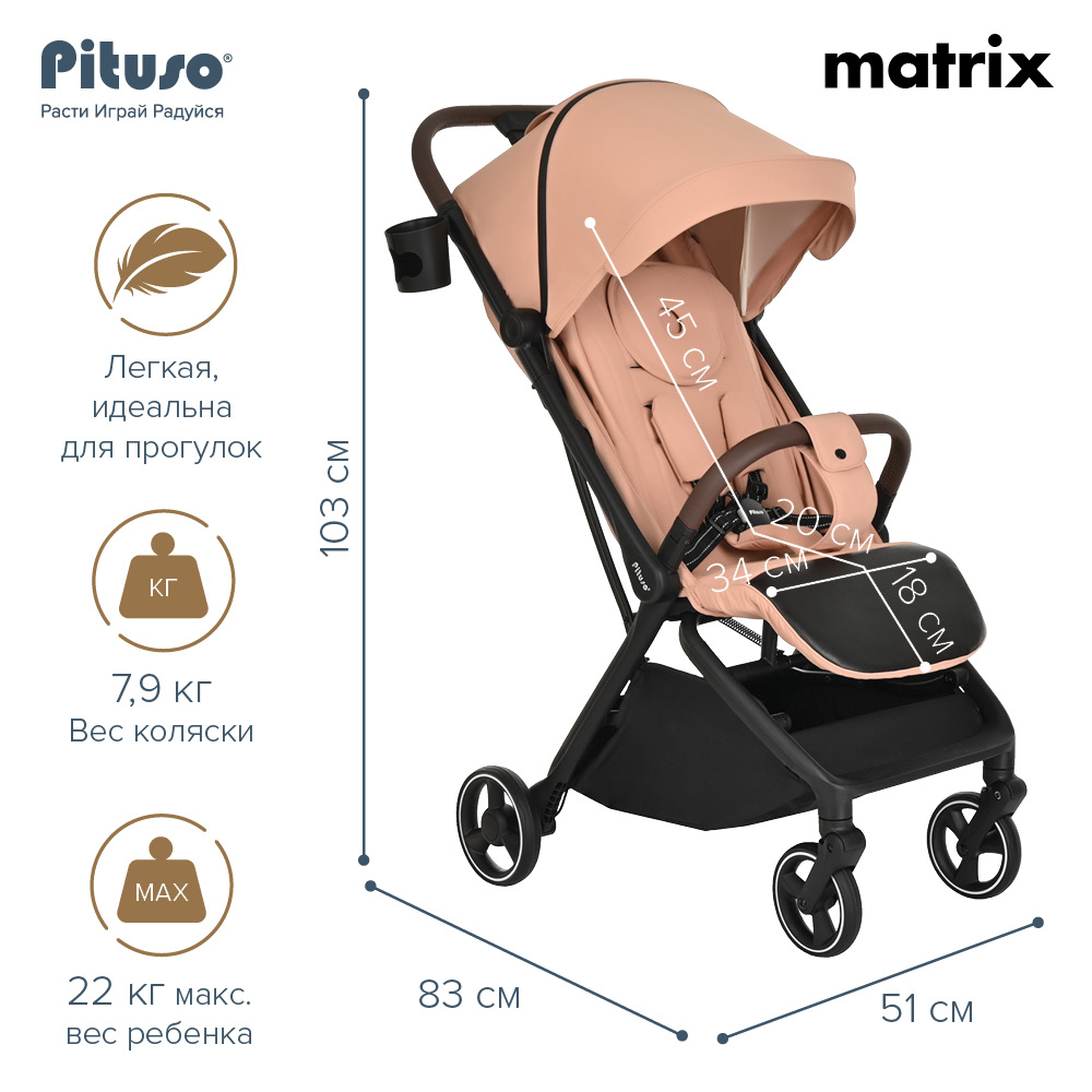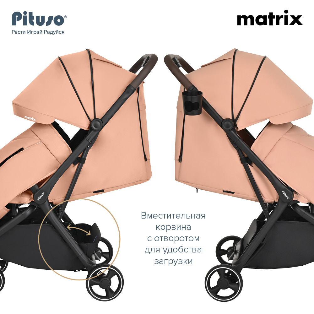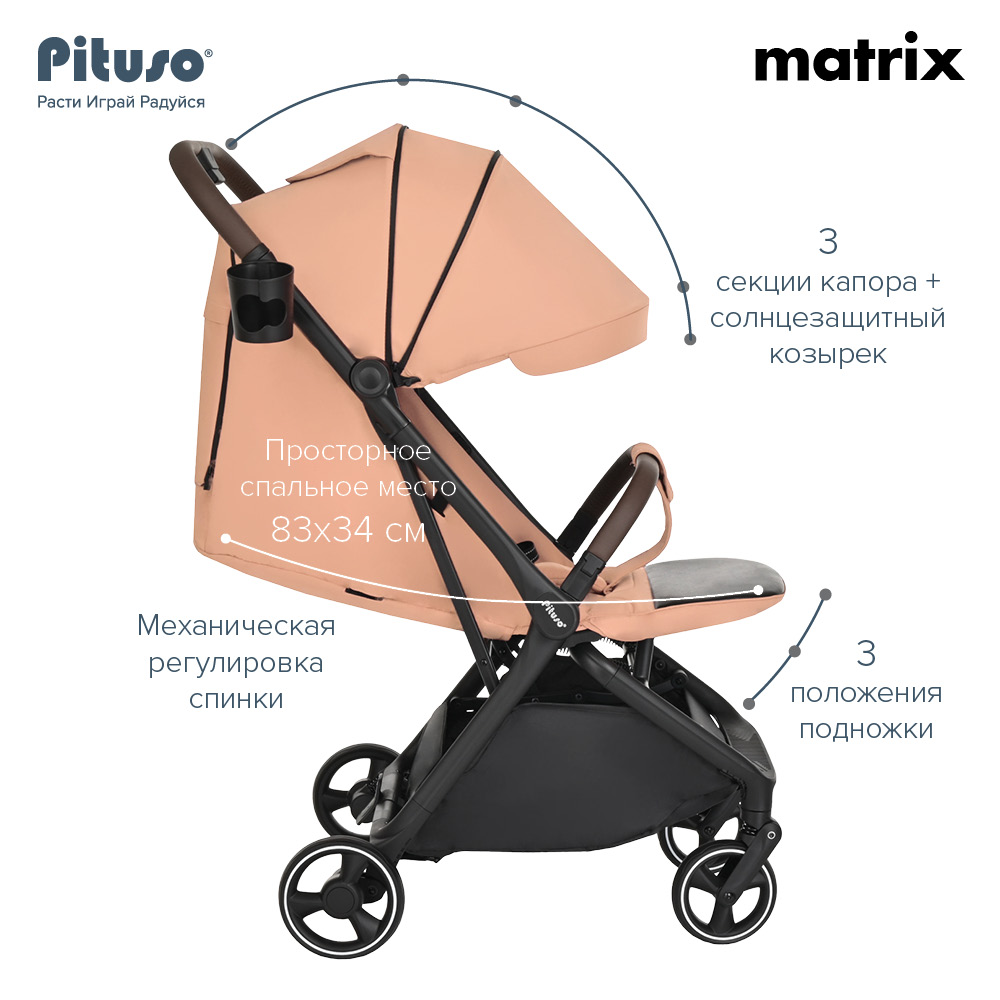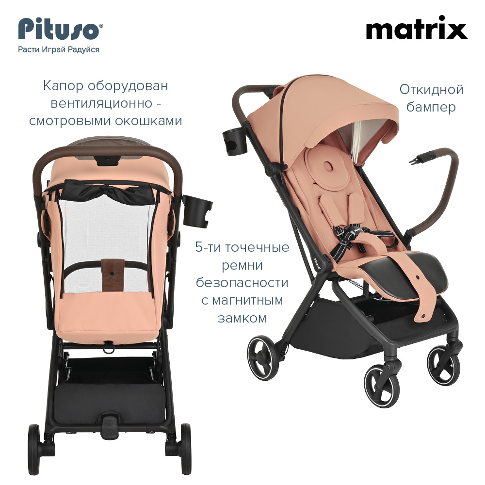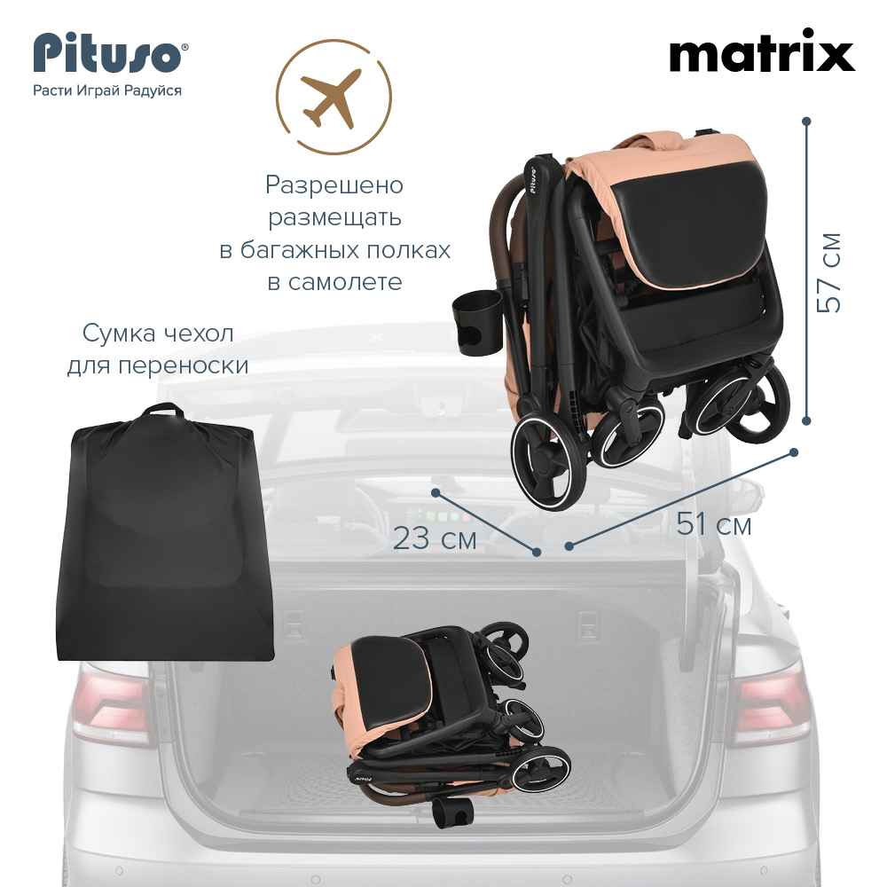 Прогулочная коляска PITUSO MATRIX (Питусо матрикс) - детская современная коляска с легким весом и супер компактным сложением. Коляска настолько компактно складывается, что с ней можно на борт самолета, будет удобно в путешествии на поезде или машине. Для сохранности коляски в сложенном виде предусмотрен специальный чехольчик для транспортировки, который входит в комплект.