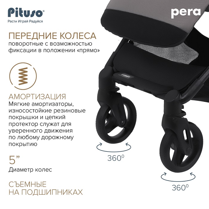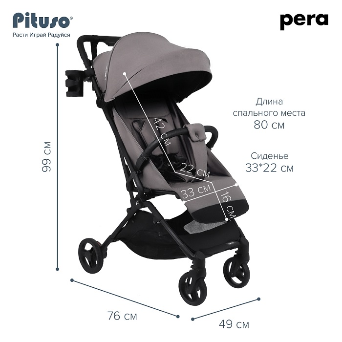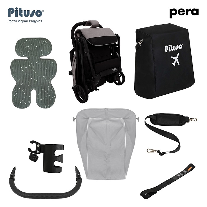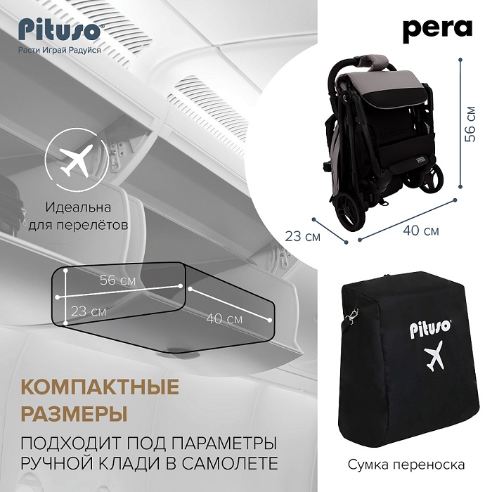 Прогулочная коляска PITUSO PERA (Питусо пера) - легкая, стильная детская коляска из карбоновой рамы, с компактным сложением, разрешенная для самолета. Коляска отлично подойдет для прогулок, путешествий и поездок на машине, поезде и самолете.