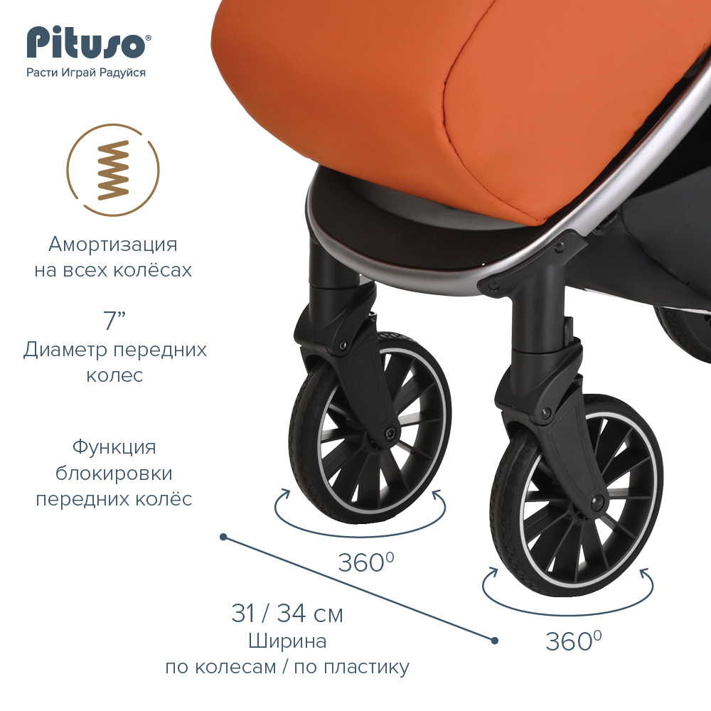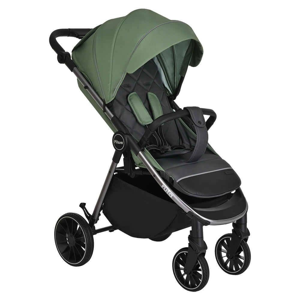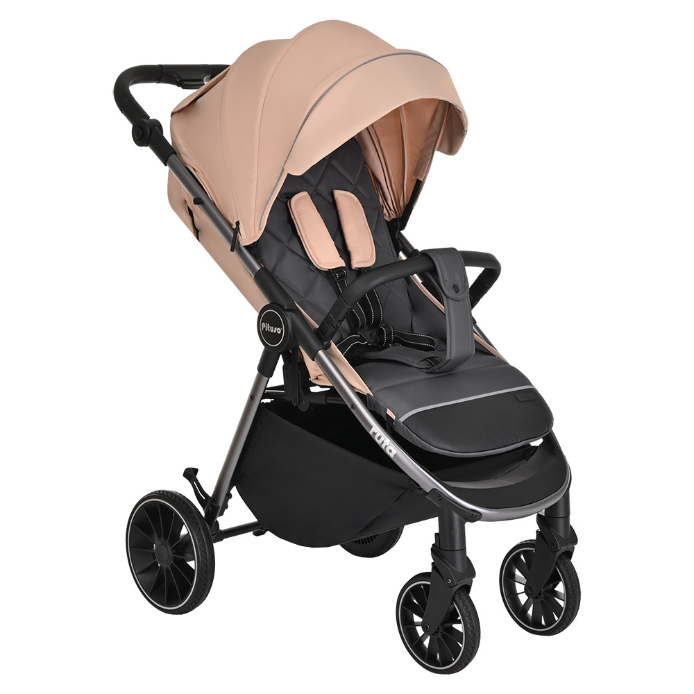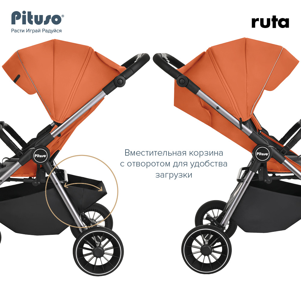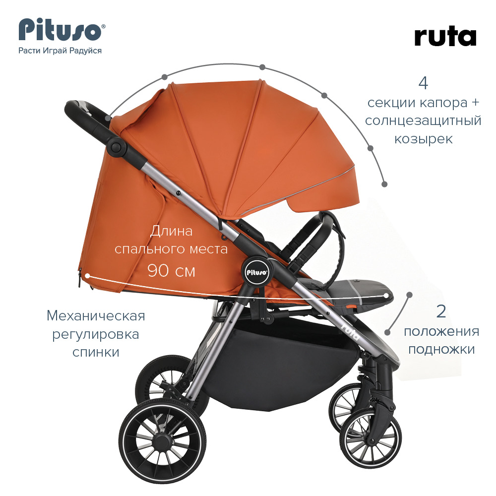 Прогулочная коляска Pituso Ruta (Питусо Рута) - стильная коляска с большим и широким сидением для ребенка от 6 месяцев до 3-4 лет. Коляска имеет легкое и надежное шасси из алюминия, что делает коляску легкой, надежной и удобной для транспортировки. Удобная система сложения позволяет быстро сложить коляску. В сложенном виде коляска фиксируется и самостоятельно стоит в вертикальном положении. У модели очень комфортное сидение с 5-ти точечными ремнями безопасности, качественной обивкой и защитой от сползания. Спинка и подножка регулируются, образуя комфортное место для сна на свежем воздухе до 90 см в длину. Большой, глубокий капюшон надежно защитит ребенка от любой непогоды, а в теплое время обеспечит оптимальную вентиляцию. Передние колеса поворотные, что позволит очень удобно и легко управлять коляской на любых дорогах. Накидка на ножки выполнена из плотного и очень теплого материала в ткани из того же материала что и сама коляски. Накидка крепится при помощи кнопок и держится очень плотно, не давая ребенку замёрзнуть. А ещё у чехольчика на ножки имеется козырек, защищающий личико ребенка от ветра. Наличие накидки на ножки просто необходимая вещь в холодное время. Приятно, что она уже идёт в комплекте с коляской.