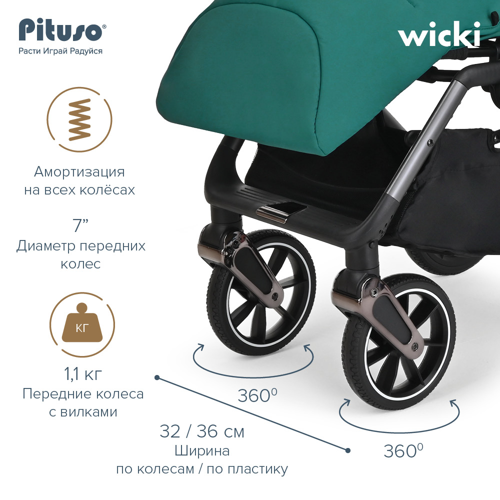 Детская коляска PITUSO WICKI оснащена практичными PU колесами, которые будут максимально просты в обслуживании, не будут бояться проколов и перепадов температуры. Для плавности и мягкости хода каждое колесо оснащено амортизацией.