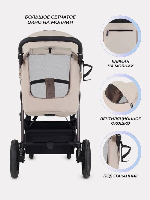 Ручка для родителей выполнена из качественной эко кожи, приятная на ощупь и регулируется по высоте. Для дополнительного комфорта во время прогулки предусмотрен подстаканник для напитков (кофе, бутылочка с водой) и москитная сетка от назойливых насекомых.