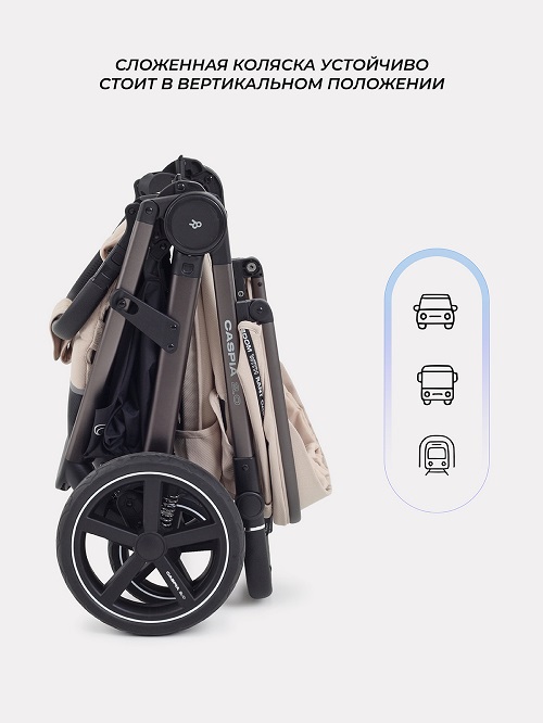 - Сложенная коляска устойчиво стоит в вертикальном положении