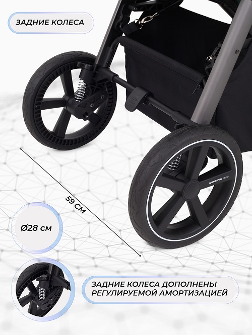 - Задние колеса оснащены регулируемой амортизацией, что обеспечит мягкий ход коляски по любым дорогам.