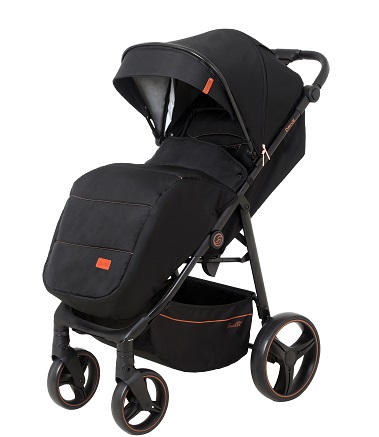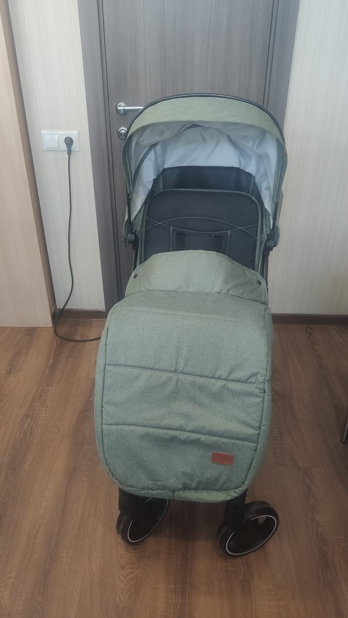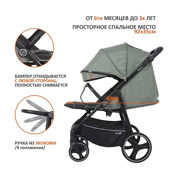 Коляска оснащена большим и просторным спальным местом 92х35 см. Плавная и тихая регулировка спинки позволит, не тревожа ребенка, опустить спинку до горизонтального положения, если малыш задремал на улице. Подножка поднимается, позволяя ножкам ребенка удобно лежать во время прогулки. Часть подножки выполнена из эко кожи и легко чистится после прогулки.