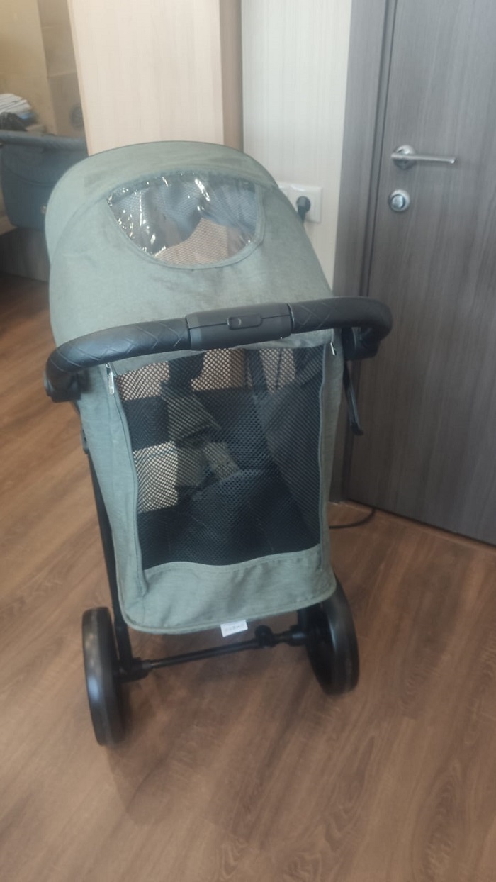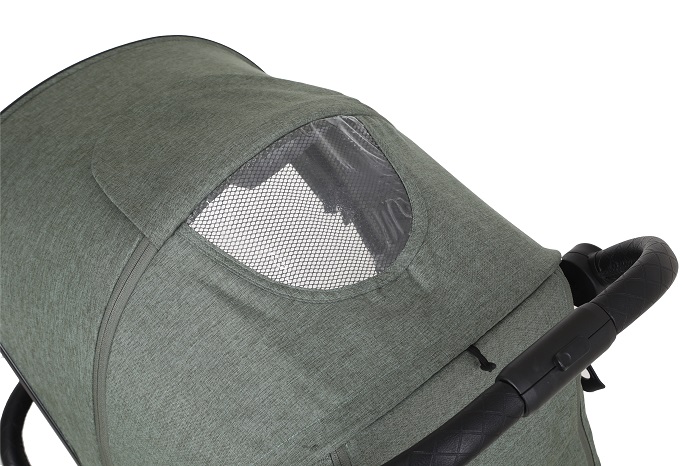 Коляска оснащена большим глубоким капюшоном. Капюшон отлично держит форму, оснащен смотровым окошком, съемным козырьком от солнца. Дополнительная секция на молнии позволит увеличить капюшон до бампера, чтобы полностью закрыть ребенка от непогоды. В задней части капюшона есть практичный карман для телефона, карты, ключей. Если на улице тепло, для лучшей вентиляции внутри коляски во время сна ребенка, открывается специальное вентиляционное окошко на молнии.