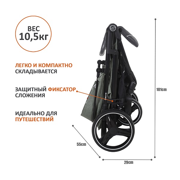 DRIVE - это всесезонная коляска, которая отлично подойдет для ежедневных прогулок с ребенком от 6 месяцев. Качественный плотный текстиль, покрывающий коляску, защитит ребенка от небольшого дождя и яркого солнца. Для дополнительного комфорта ребенка в прохладное время года предусмотрена накидка на ножки. С внутренней стороны накидки есть специальная защита от грязных ножек.