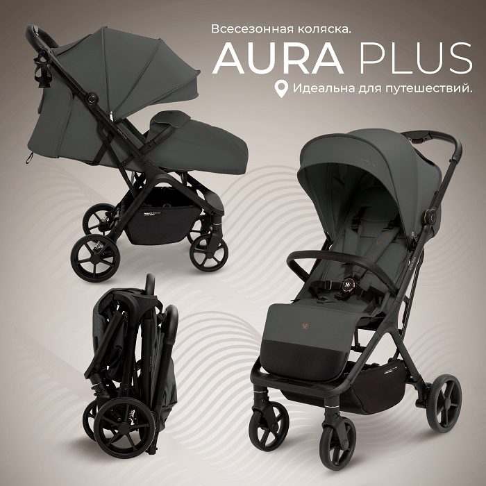 Коляска Aura Plus оснащена увеличенными по сравнению с предыдущей моделью резиновыми колесами. Они не сдуваются и не прокалываются. Прекрасно справляются с разным дорожным покрытием. Благодаря передним поворотным колесам и удобной ручке родителям будет удобно управлять коляской.