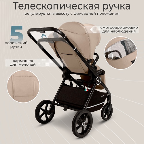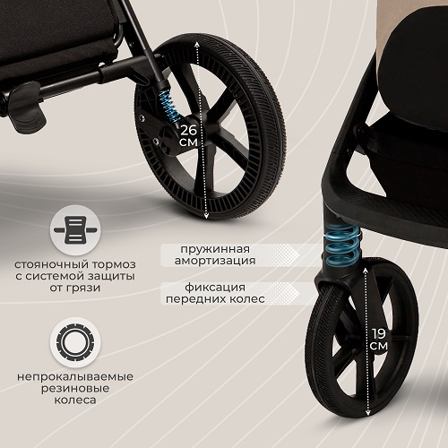 Коляска оснащена современными резиновыми колесами с амортизацией. Передние поворотные колеса и регулируемая по высоте родительская ручка позволят легко управлять коляской по любым дорогам.