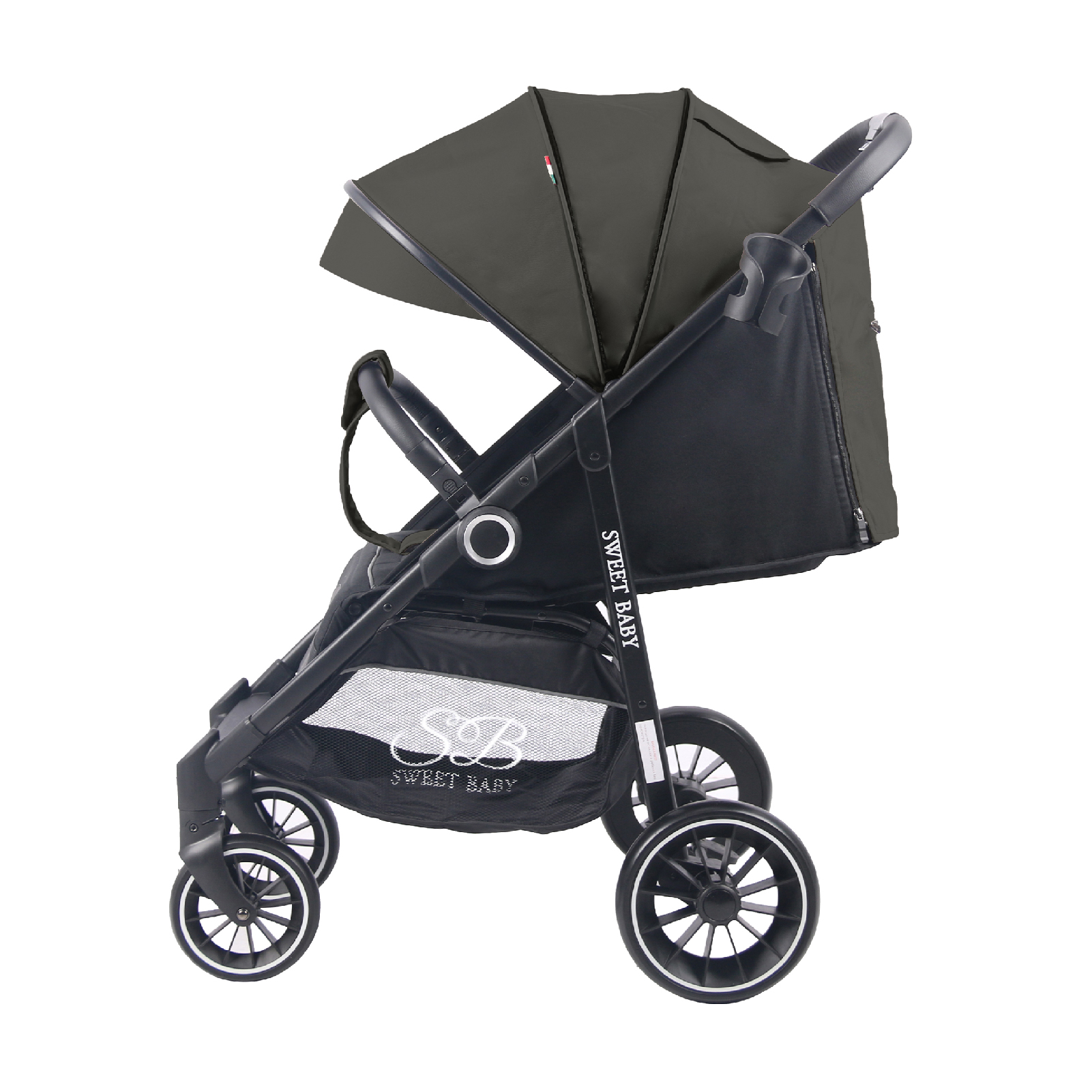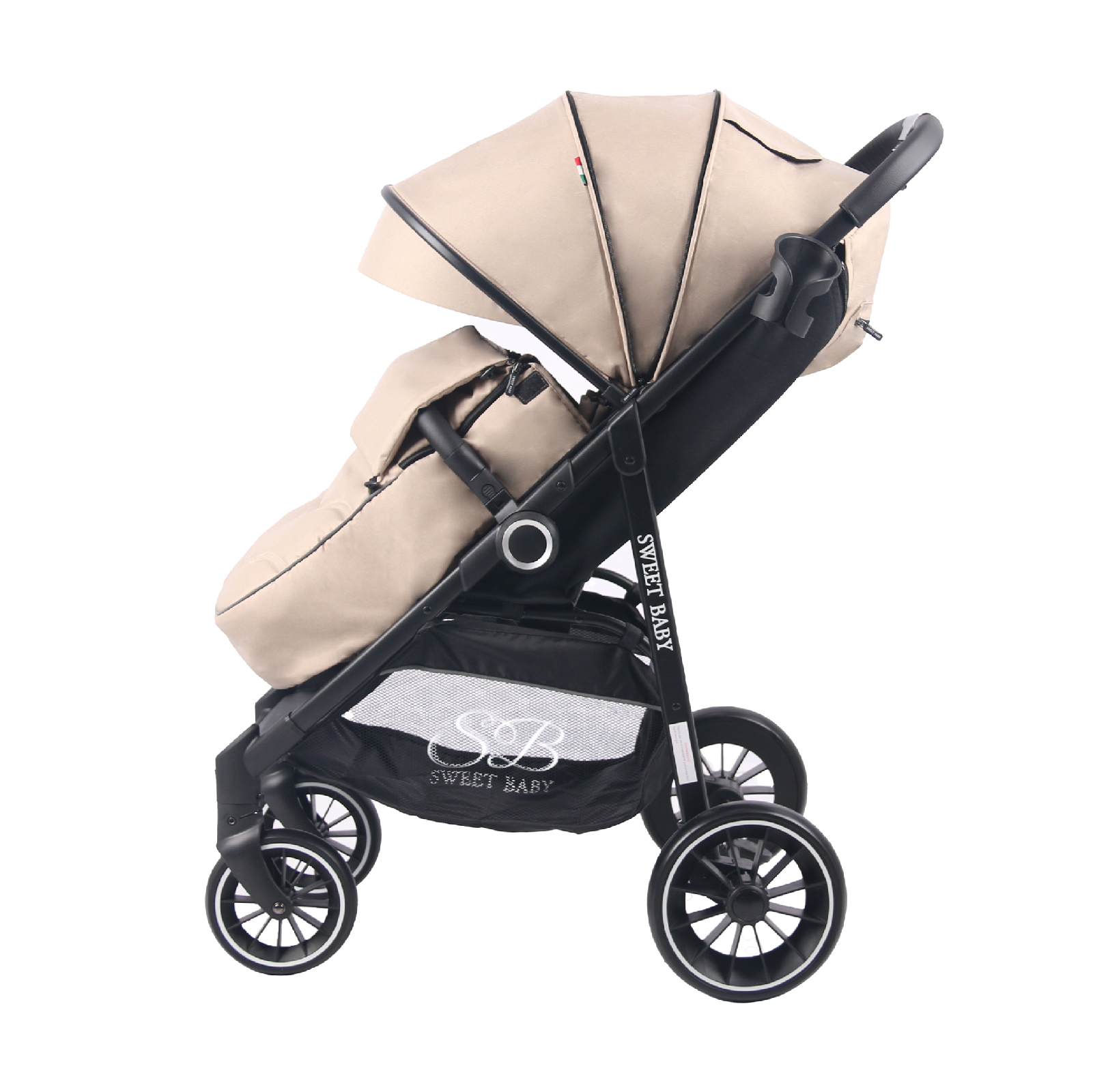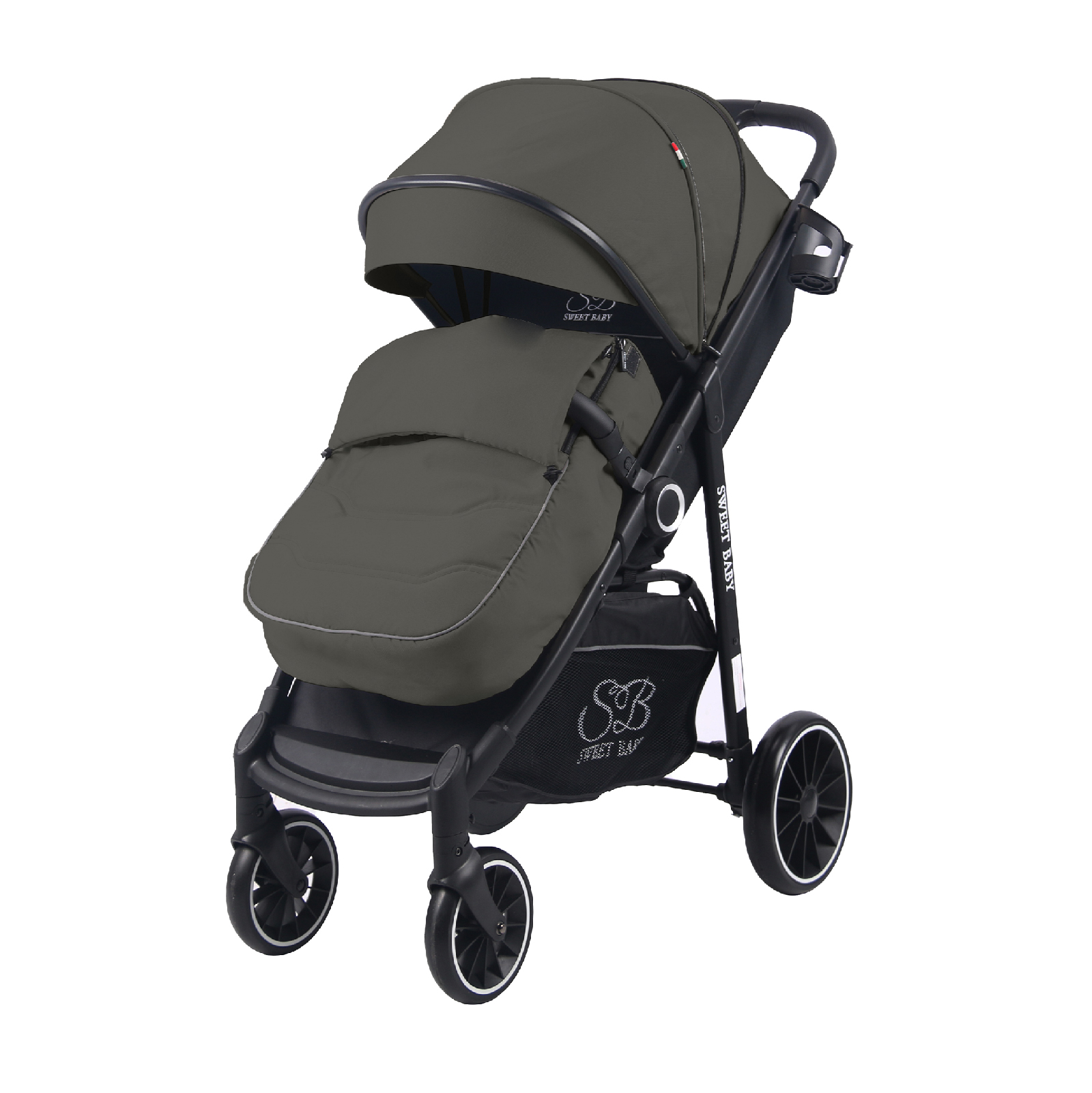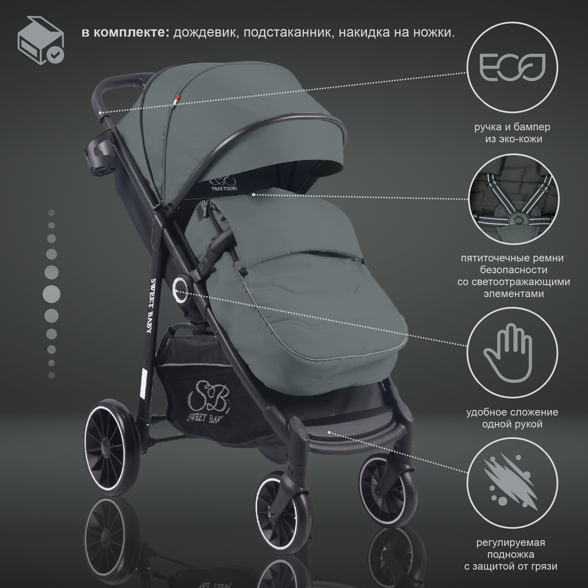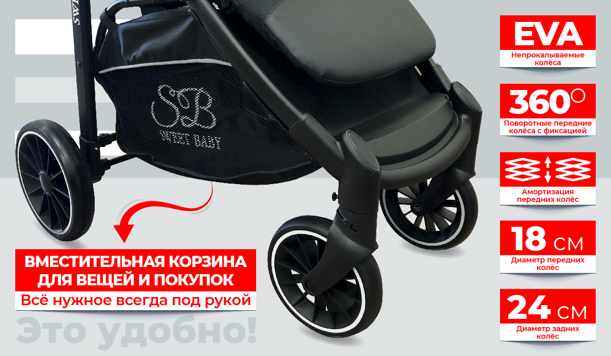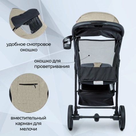 Для удобства родителей в коляске предусмотрена большая корзина для игрушек и вещей, и подстаканник для любимых напитков.