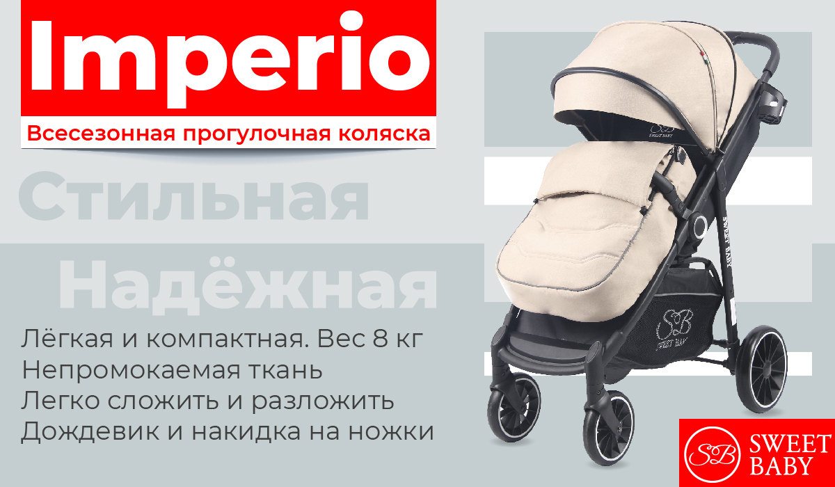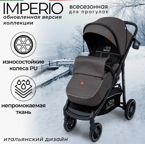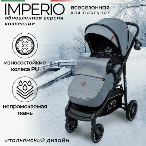 Прогулочная коляска Sweet Baby Imperio (Свит беби империо) - всесезонная коляска для ребенка от 6 месяцев до 3-4 лет. Обивка коляски ветро и влагозащитная, а огромный капюшон надежно укроет от любой непогоды. Дополнительно коляска оснащена утепленной накидкой на ножки с ветрозащитой, которая позволит комфортно гулять в холодное время года.