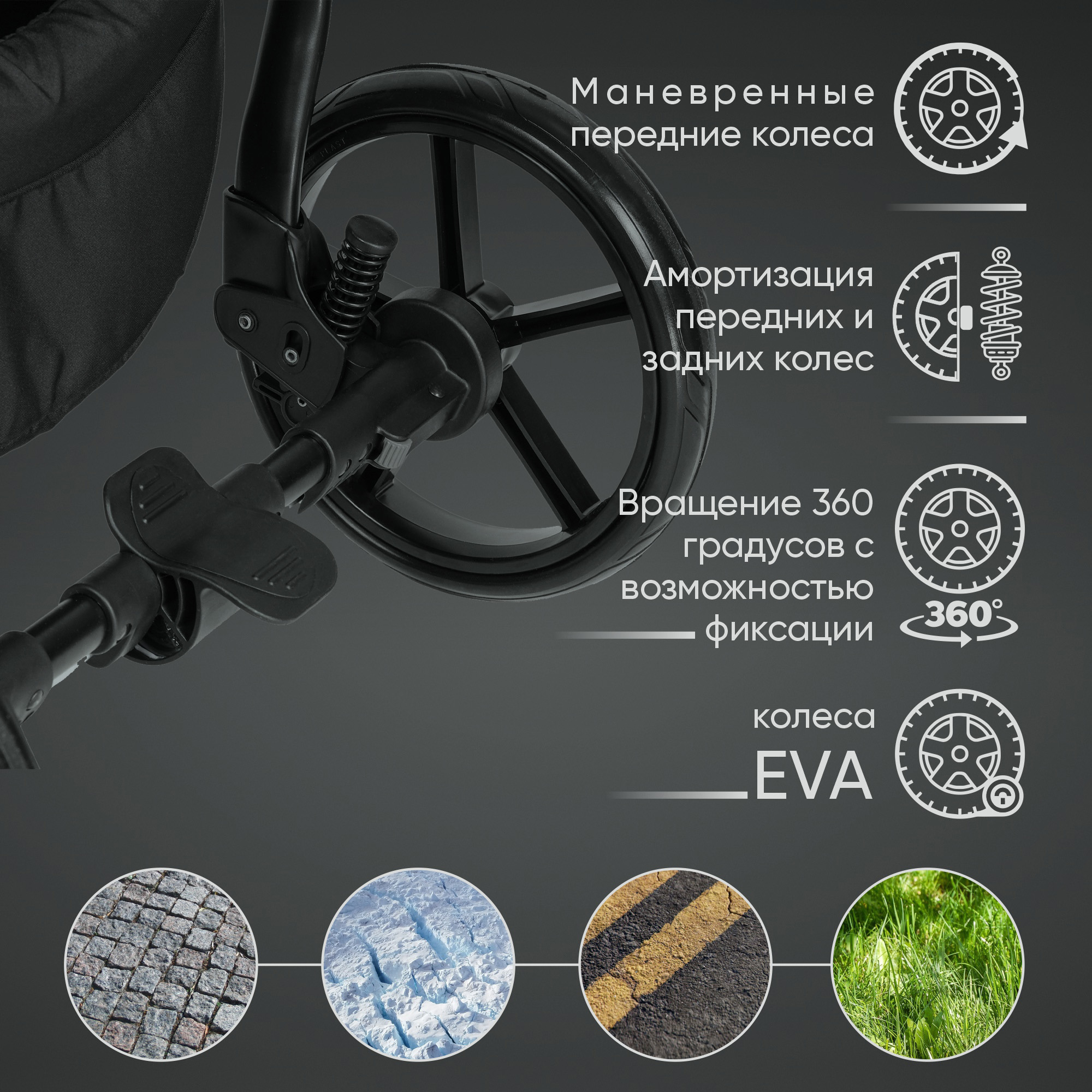 Коляска легко справляется с бездорожьем за счет больших задних колес и амортизации. Передние колеса меньшего диаметра оснащены поворотным механизмом: на плохой дороге колеса фиксируются в положение только прямо, а на ровной поверхности легко поворачиваются на 360 градусов, обеспечивая удобное управление коляской.