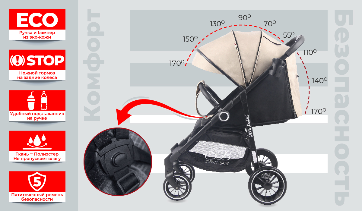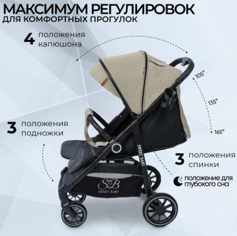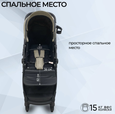 Большим преимуществом модели является комфортное спальное место 81х36 см, с почти полностью горизонтальным наклоном спинки. Вашему ребенку будет комфортно в коляске не только гулять, но и спать. Спинка коляски регулируется механически, в 3х положениях, без ремешков.