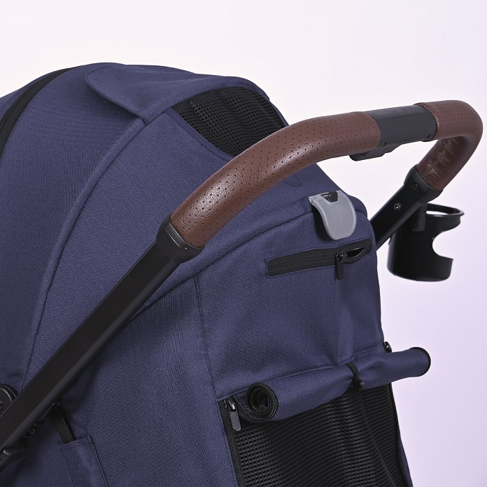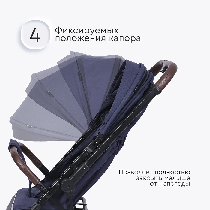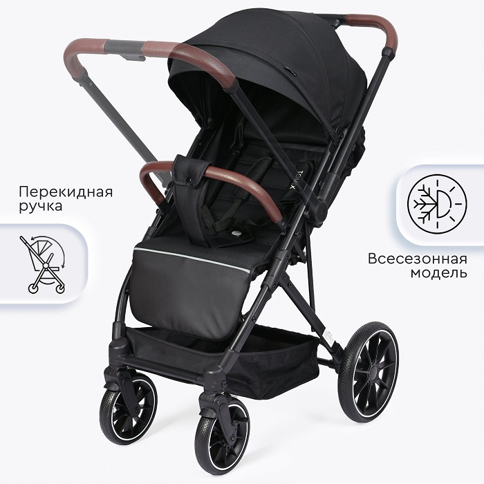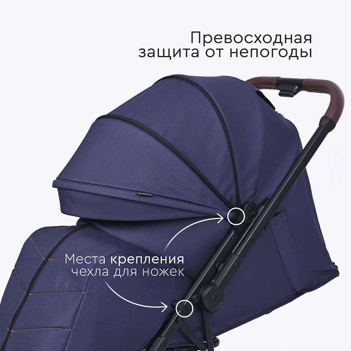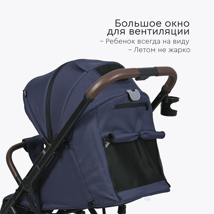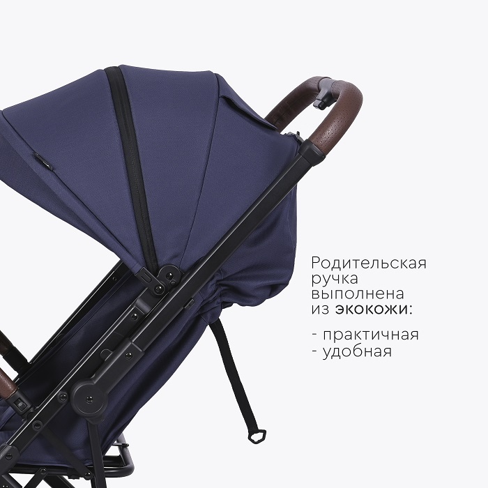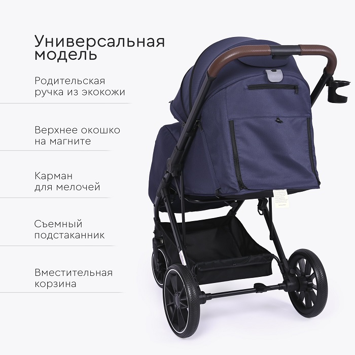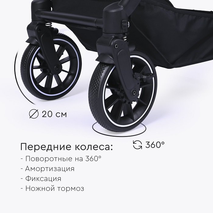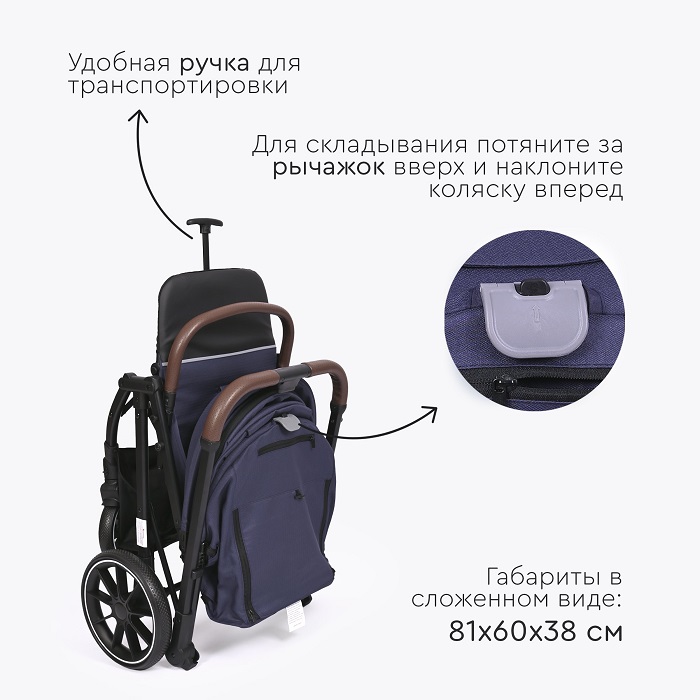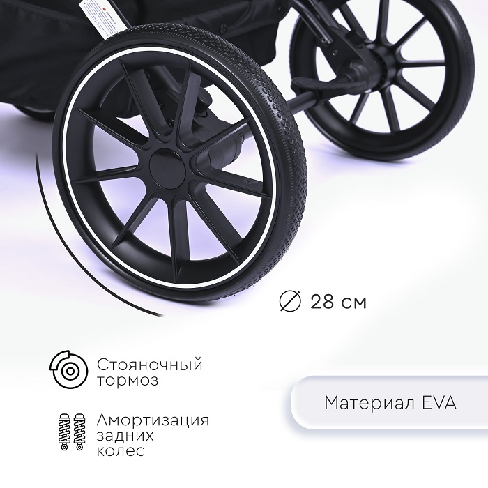 Коляска оснащена компактным сложением и специальной ручкой для перевозки в сложенном виде. Коляска отлично подойдет для поездок на машине, путешествий, для домов, где нет лифта. Большие EVA колеса отлично справятся с городскими дорогами, ямами, лужами и грязью. Передние колеса поворотные на 360 градусов, но имеют возможностью блокировки данной функции для поездок только прямо (актуально при перекидывании ручки).