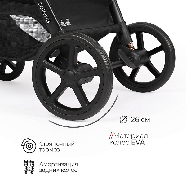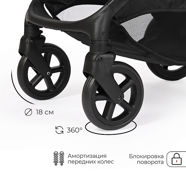 - поворотные передние колеса с фиксацией диаметром 18 см, задние колеса – 26 см, материал колес — EVA;