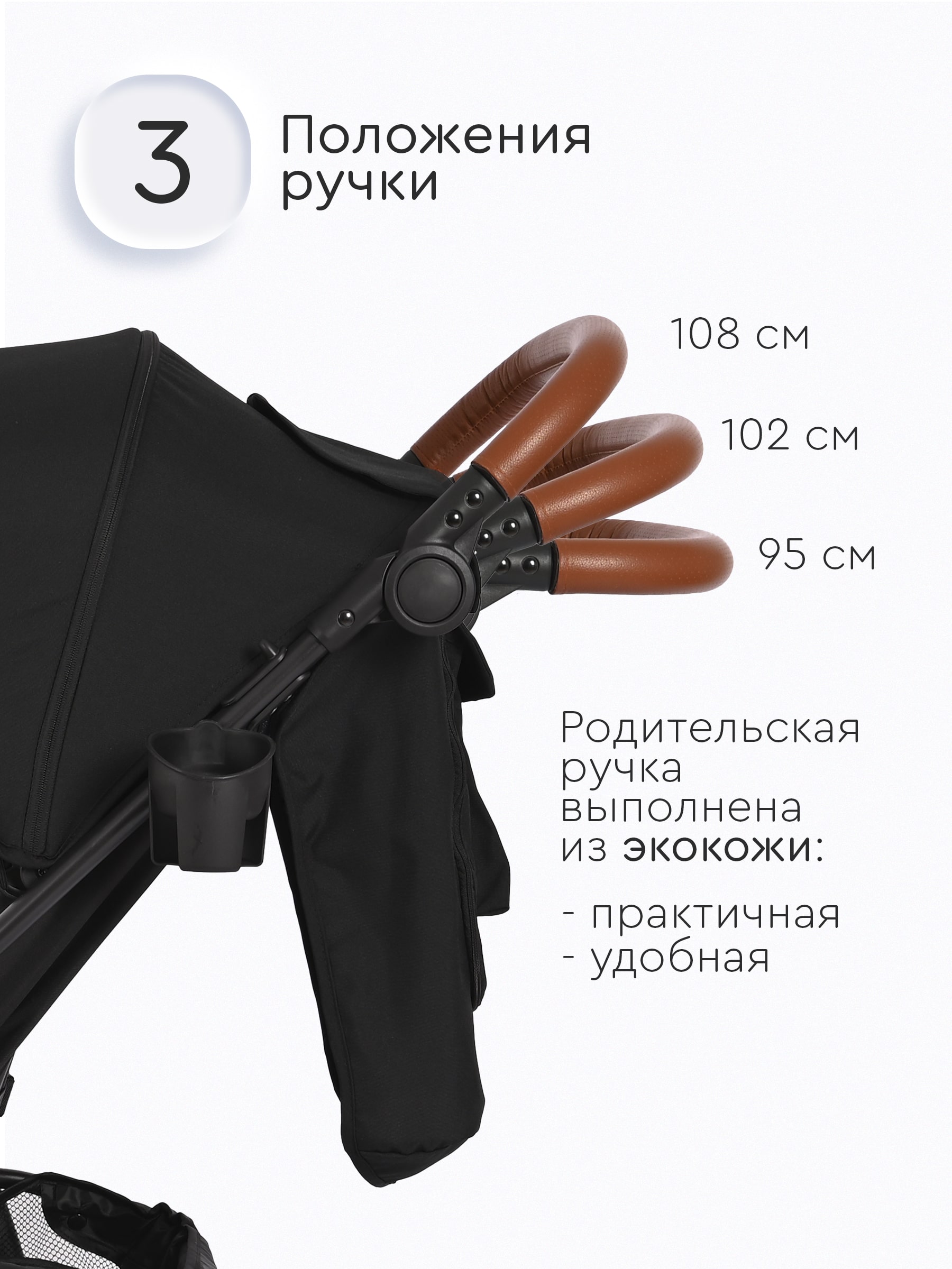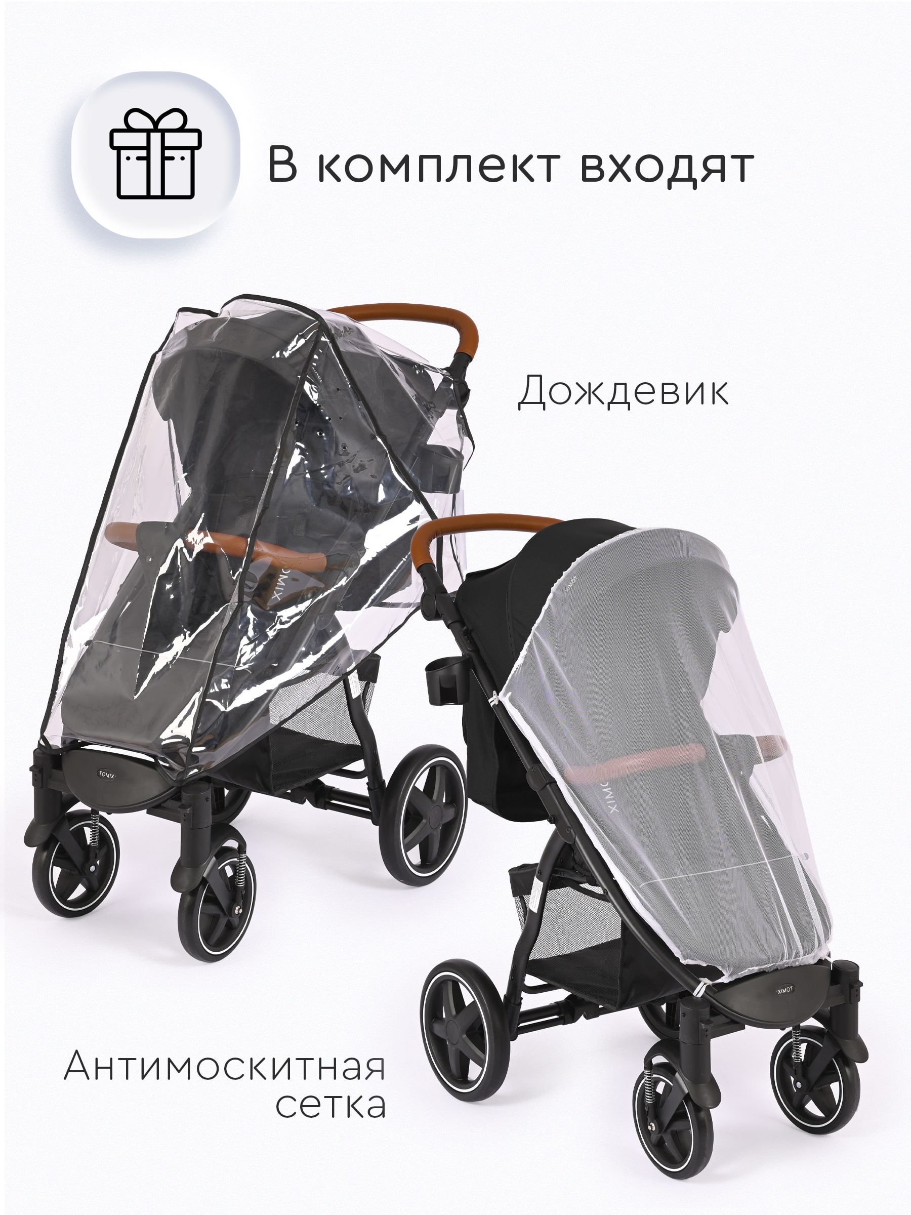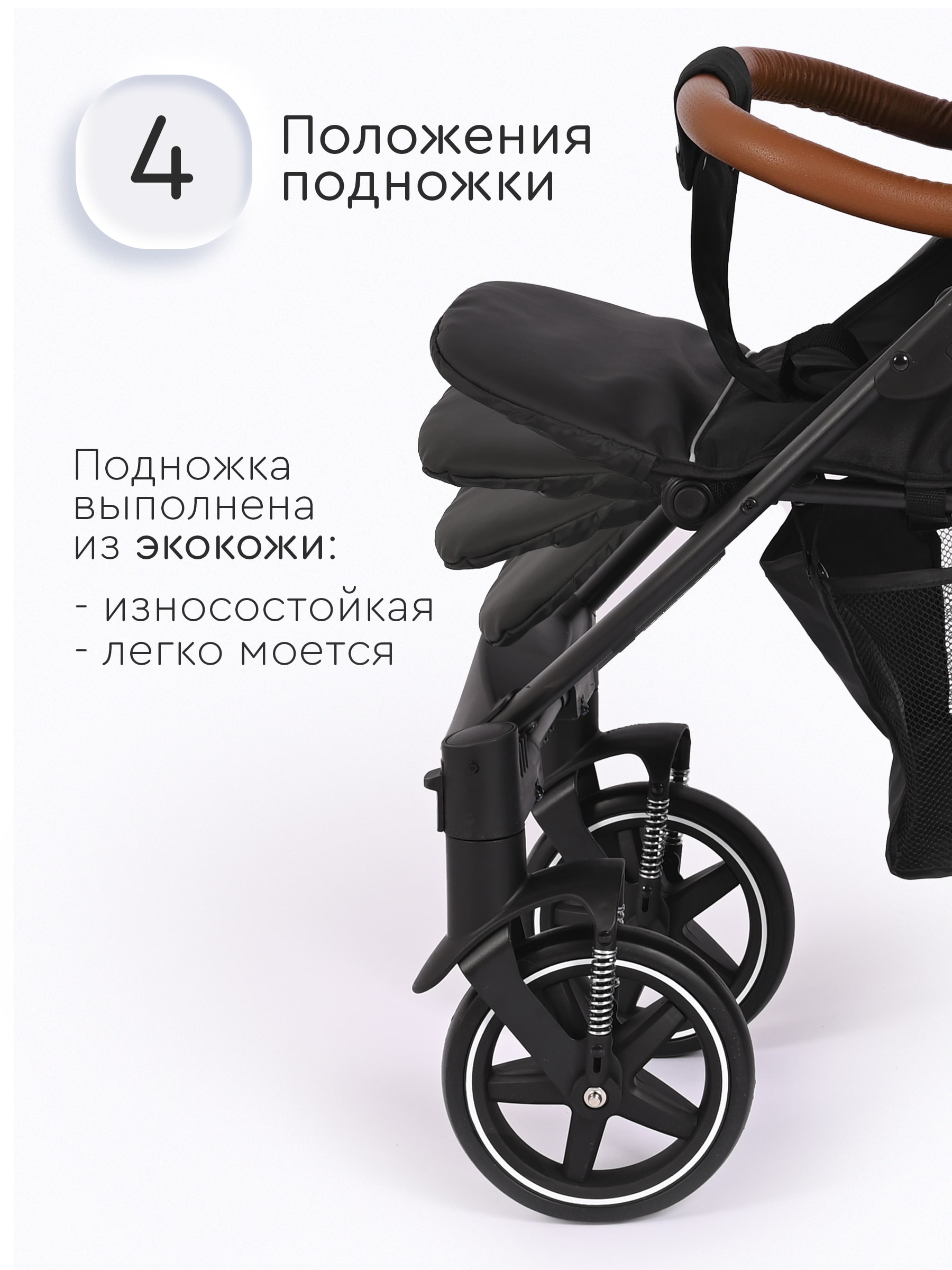Дизайн коляски продуман до мелочей, глубокий красивый цвет ткани, ручка и бампер из экокожи делают эту модель необыкновенно стильной, а подножка из прорезиненного материала и легкая в уходе ткань обеспечивают практичность и удобство использования. В комплекте с коляской идут дождевик, москитная сетка и подстаканник.