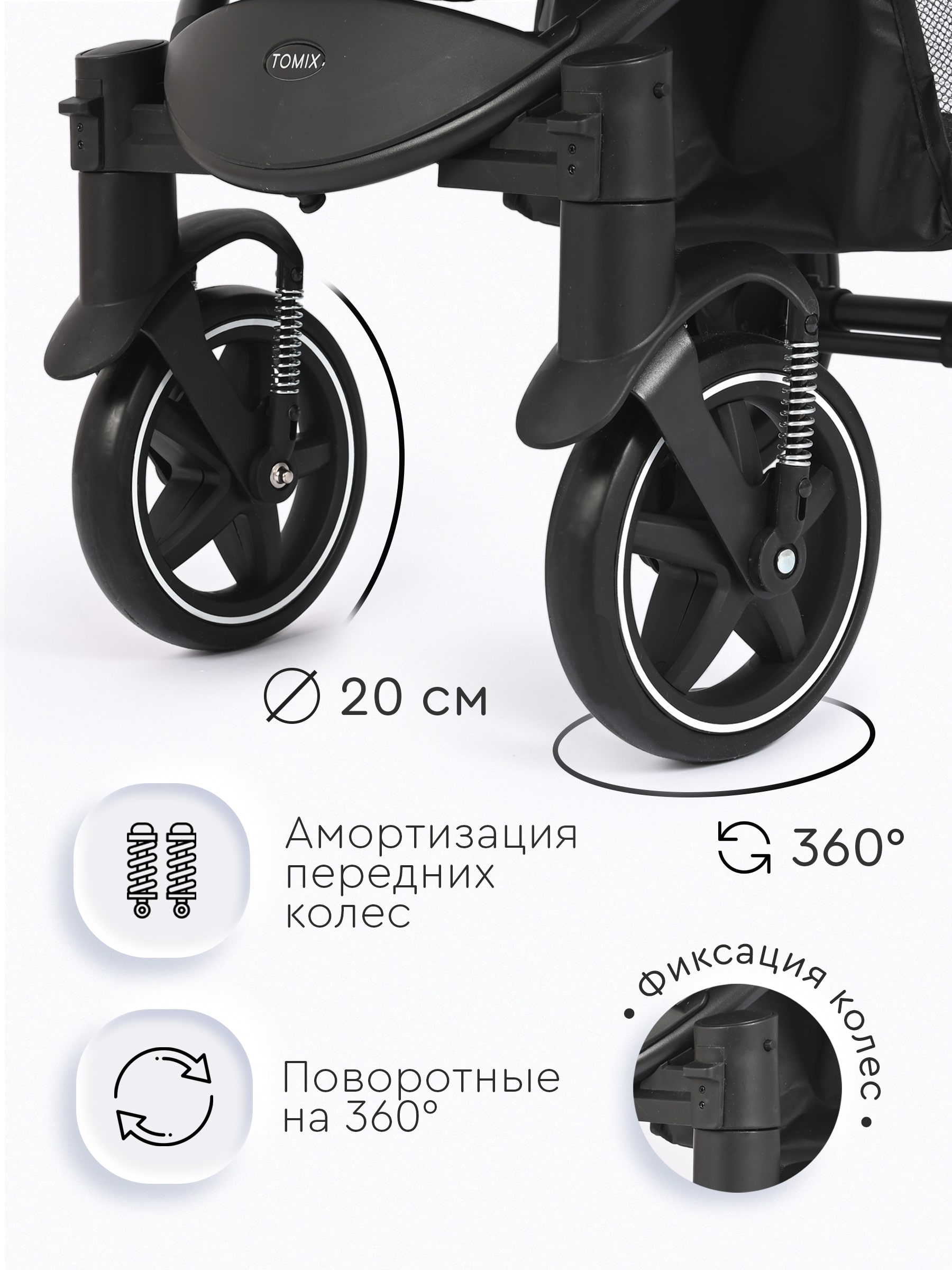 Коляска Tomix STELLA (Томикс Стелла) - всесезонный надежный транспорт для прогулок с ребенком в любое время года. Коляска прекрасно справится с неровностями дороги, снегом, бездорожьем или песком. Колеса увеличенного диаметра и встроенная амортизация подарят вам отличное управление и мягкий ход. Большое спальное место с полностью горизонтальной спинкой позволит ребенку комфортно спать на улице и подойдет даже для ребенка младше 6 месяцев. Глубокий капюшон до бампера и утепленная накидка на ножки надежно защитит ребенка от ветра, снега и осадков. Дл удобство мамы предусмотрен удобный кармашек и смотровое окошко.