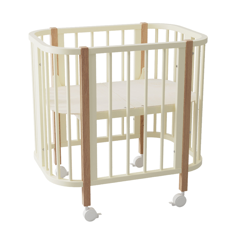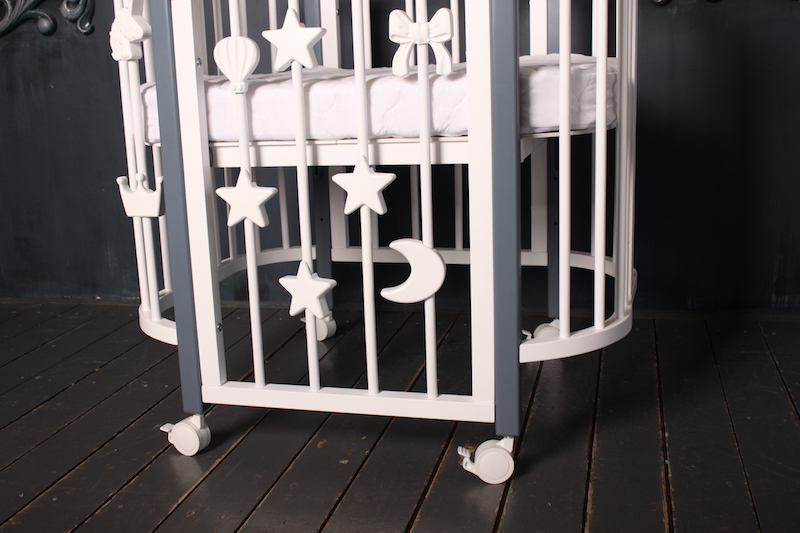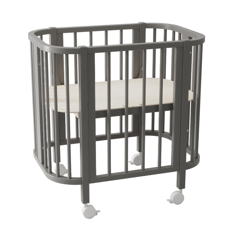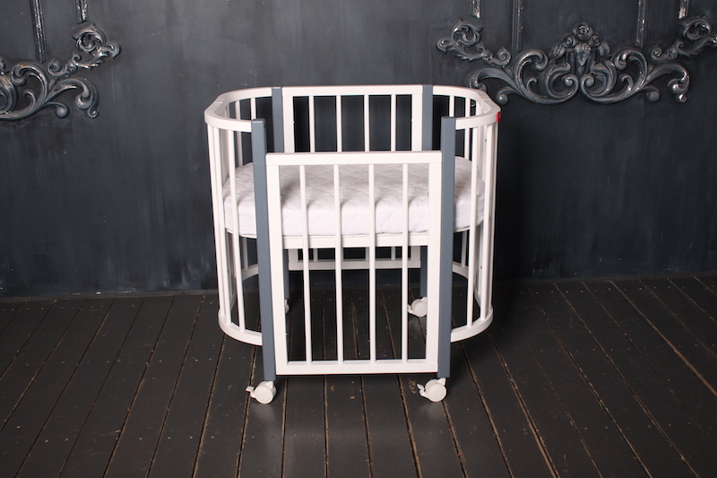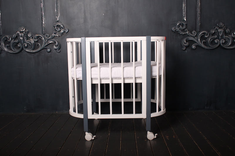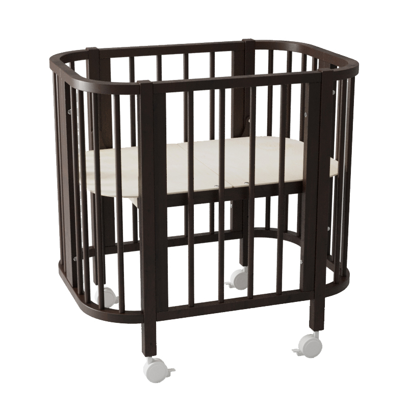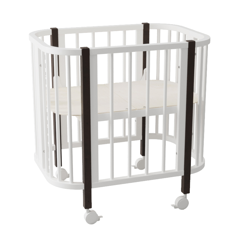 Компактные размеры кроватки позволяют легко вписать ее даже в небольшое пространство. Благодаря небольшой ширине и колесам кроватка легко проходит через дверные проемы, что позволит легко передвигать ее по квартире.