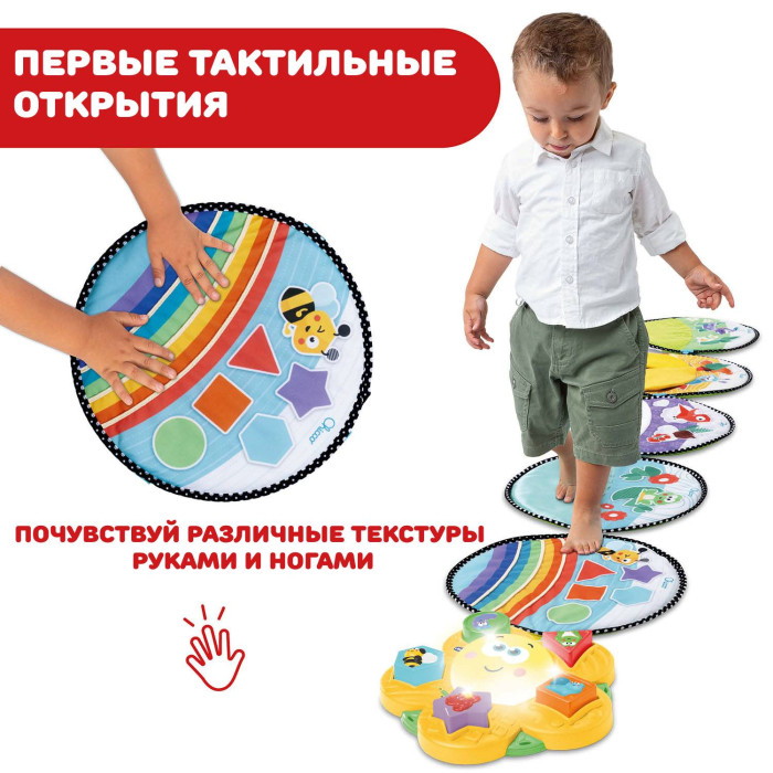 - 5 тканевых дисков (4 сезона и 1 радуга) с разными текстурами: каждый диск характеризуется особым стимулом, который помогает ребенку развить определенные навыки.