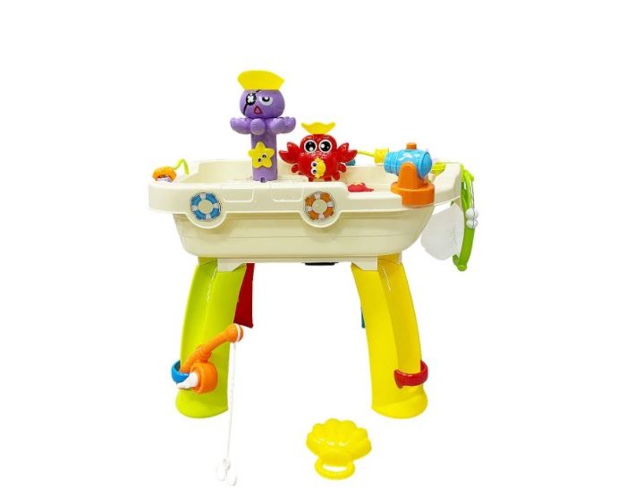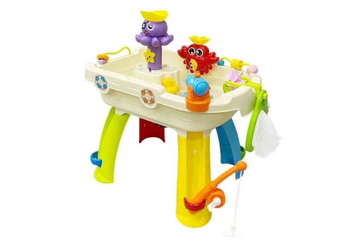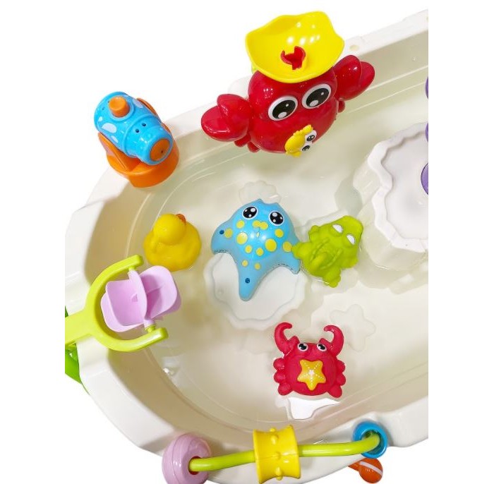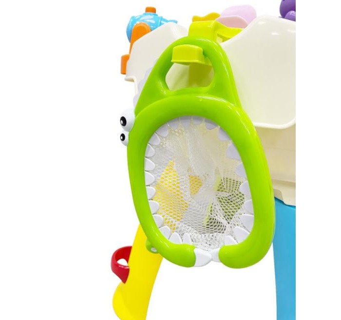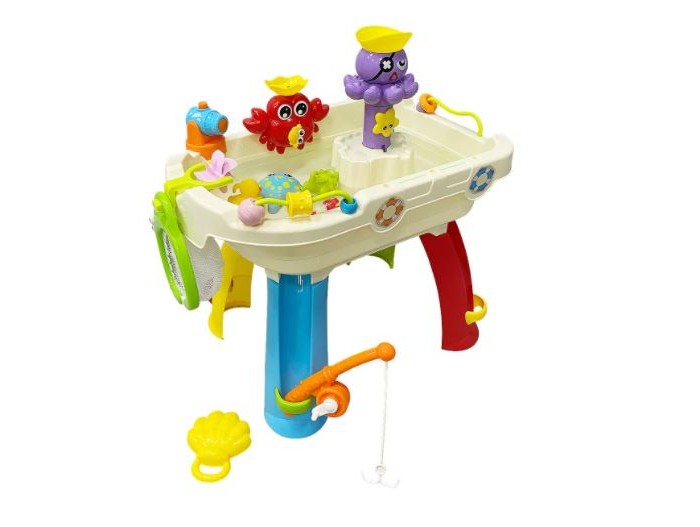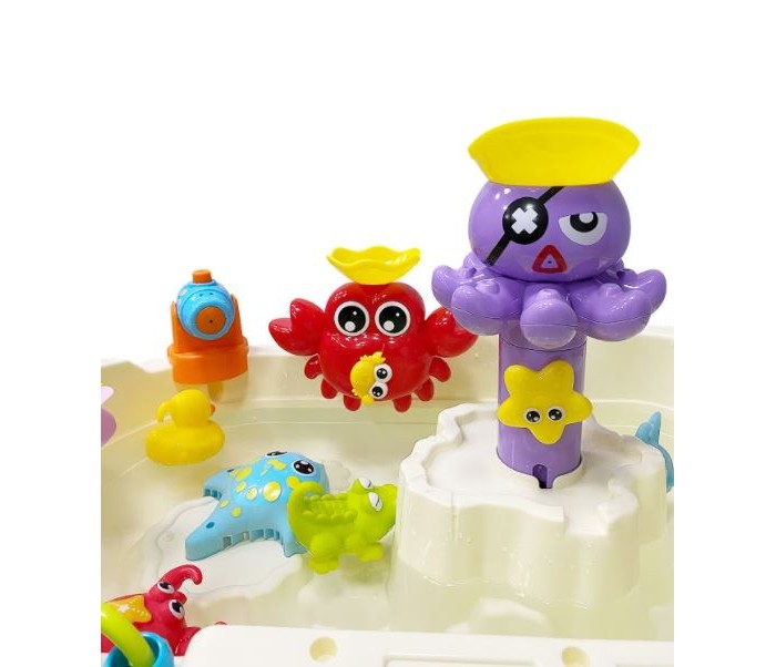 Развивающий игровой центр Everflo Aqua park HS0422941 (Еверфло Аква Парк) — лучшая игрушка для игр с водой! Ваш малыш будет проводить с ней все свободное время, наслаждаясь увлекательной рыбалкой и обустройством мини-бассейна. Игрушка развивает мелкую моторику, глазомер, координацию движений.Модель представляет собой небольшую ванну на 4-х ножках, в комплекте к которой идут удочка, сачок, водяная пушка, 4 резиновых игрушки (уточка, краб, крокодил, кит), а также игрушки (краб, пират и колесо), части которых приходят в движение от контакта с водой по принципу мельницы: воду нужно заливать специальным черпачком в отверстия сверху игрушек. У центра есть кнопка музыкального сопровождения, а также кнопка включения течения, которая активирует движение воды внутри ванночки. Удочкой и сачком можно ловить резиновые игрушки. Создавайте модель идеального аквапарка вместе с ребенком! Купите детский центр Aqua Park и подарите себе и малышу долгие приятные часы занимательной игры.