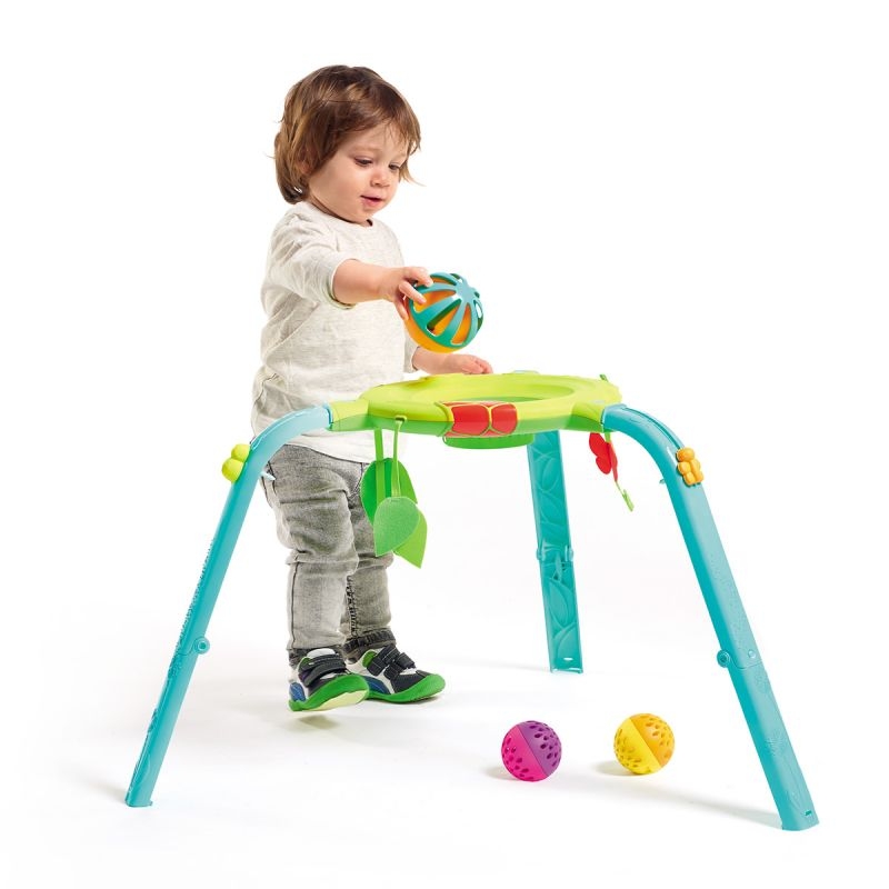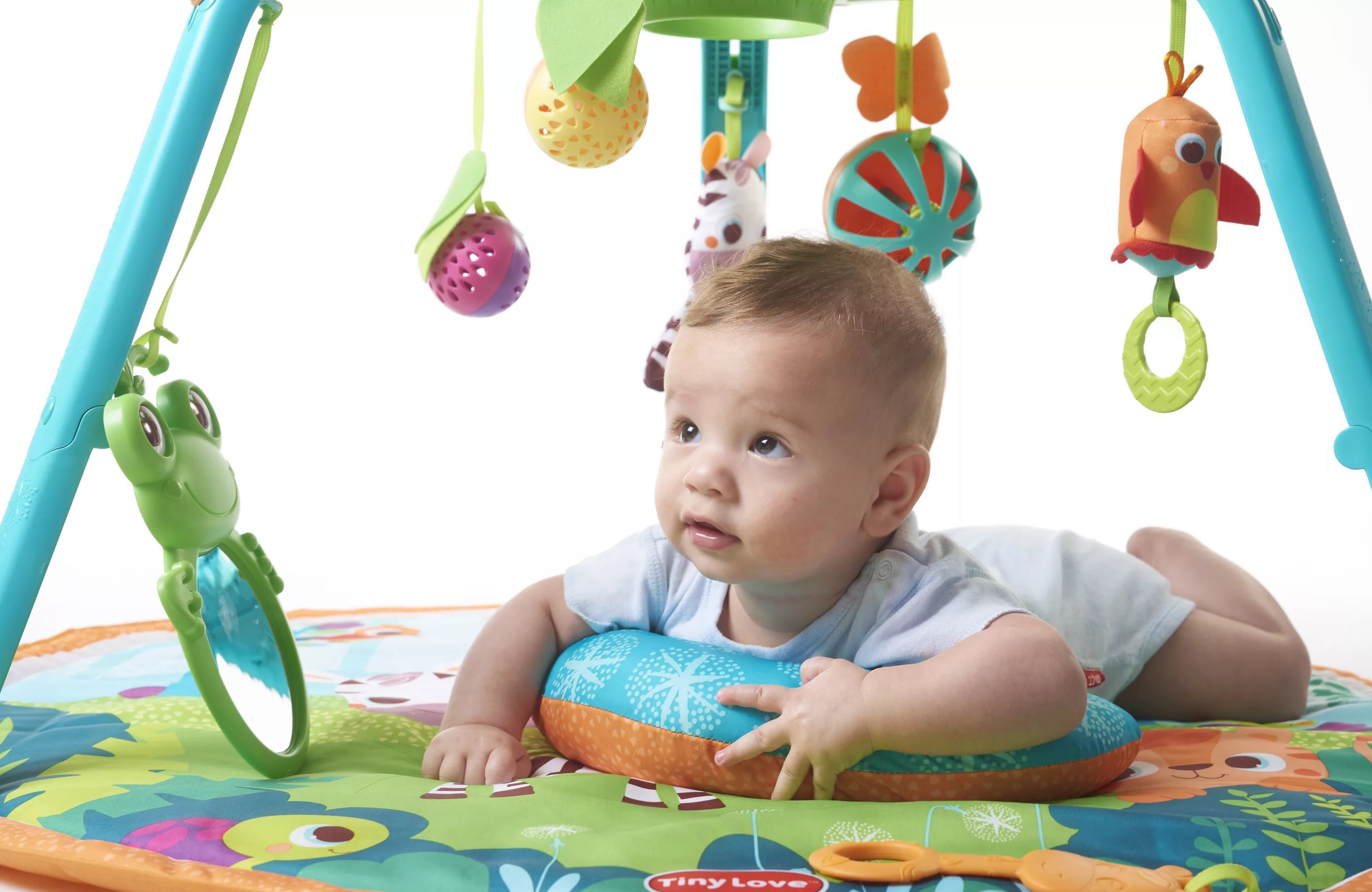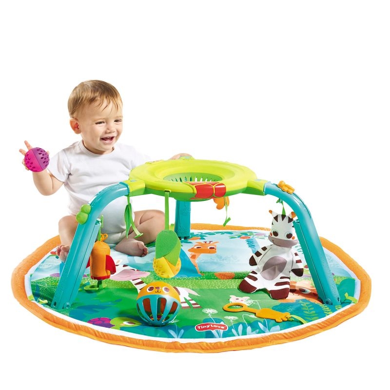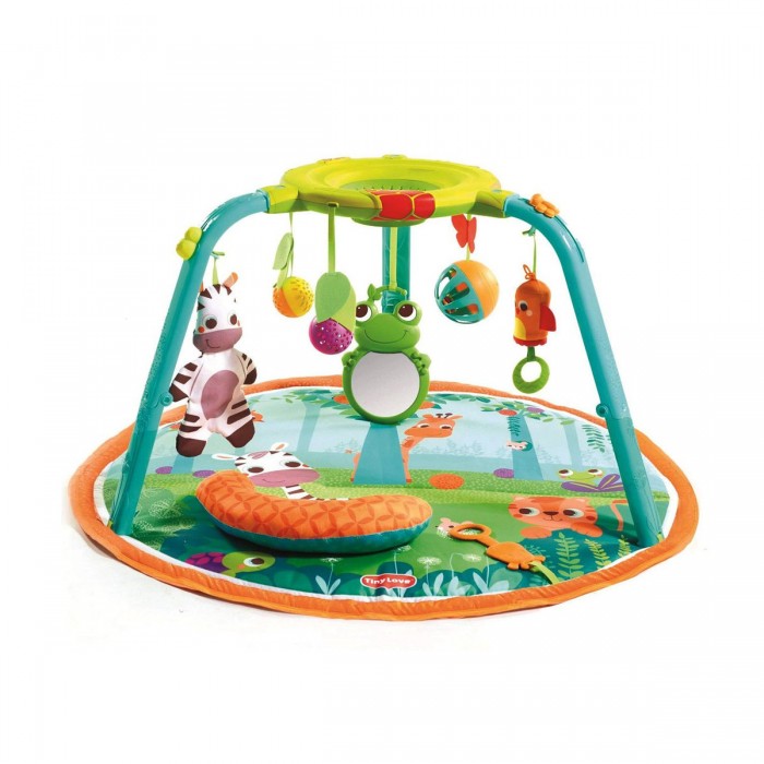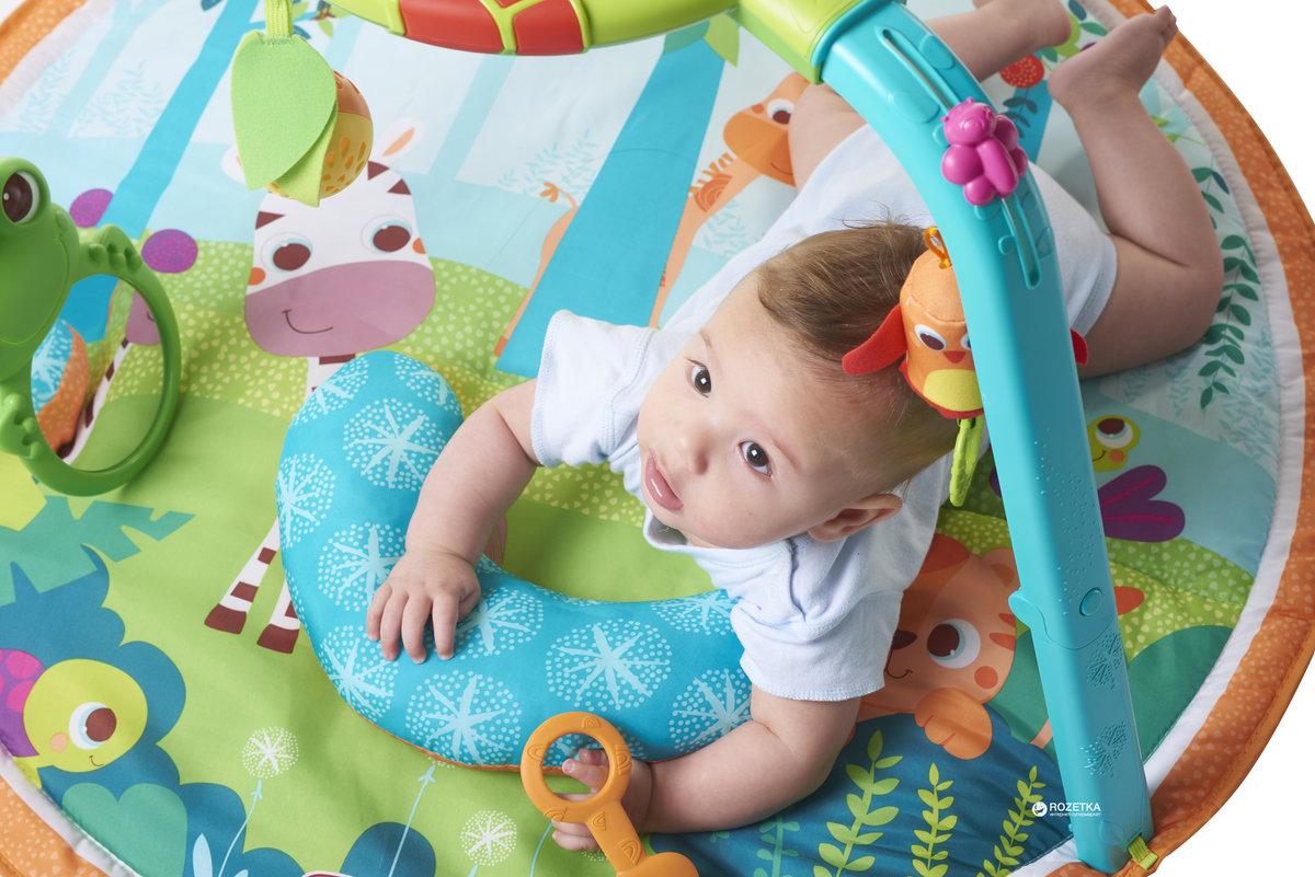 Развивающий коврик Tiny Love Я расту! (Тини Лав) - многофункциональный игровой центр для ребенка с рождения. В этот центр можно играть лежа (пока ребенок совсем маленький), сидя и даже стоя. Эта игрушка стимулирует развитие ребенка, подталкивая малыша к новым для него действиям. Этот коврик включает в себя 15 увлекательных функций, в том числе музыкальную электронную игру с шариком, музыкальную подвеску в виде птицы, шуршащую зебру, мяч с шариками в виде тигра, зеркальце в виде лягушки и многое другое. Инновационная электронная игра с шариком оснащена мигающими лампочками и музыкой (три режима), а также спиралью для шариков. Режим 1 - Лежа: удобная подушка для лежания на животике и большой выбор стимулирующих игрушек, которые помогают увлечь ребенка и продлить время выкладывания на живот, или развлечь его в то время, что он лежит на спине. Режим 2 - Сидя: коврик складывается и превращается в развлекательный центр с интерактивной игрой в шарик, которая помогает укреплять навыки мелкой моторики и укрепляет мышцы, необходимые для сидения. Режим 3 - Стоя: веселая спиральная игра с шариком занимает стоящего малыша и стимулирует его когнитивное развитие.