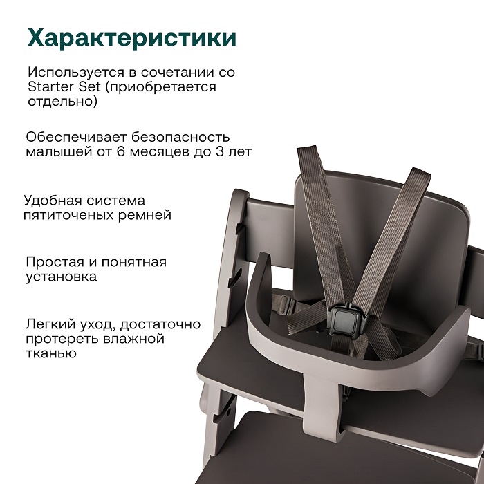 Ремни безопасности делают стульчик Moji Yippy максимально безопасным, исключают соскальзывание, при этом не сковывают движений малыша. Используются только в сочетании со Starter Set. Устанавливают без дополнительных инструментов. Рекомендуются для деток от 6 месяцев, которые самостоятельно сидят, и до 3 лет (вес до 15 кг).