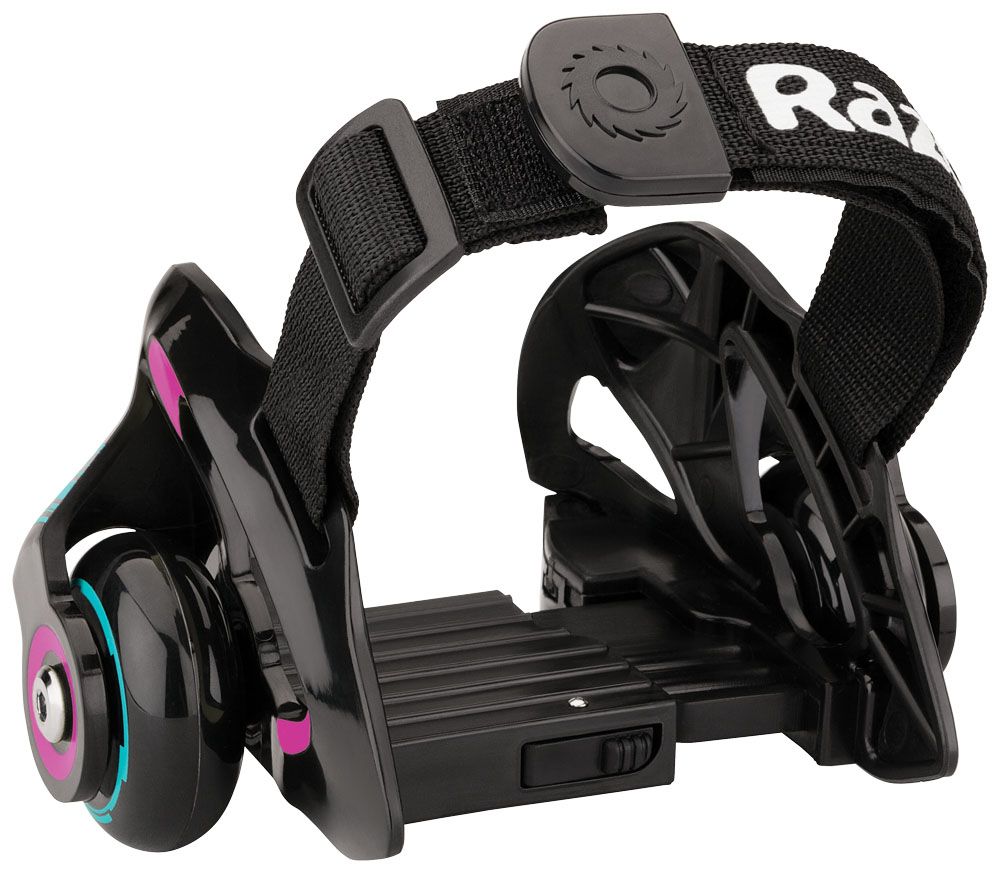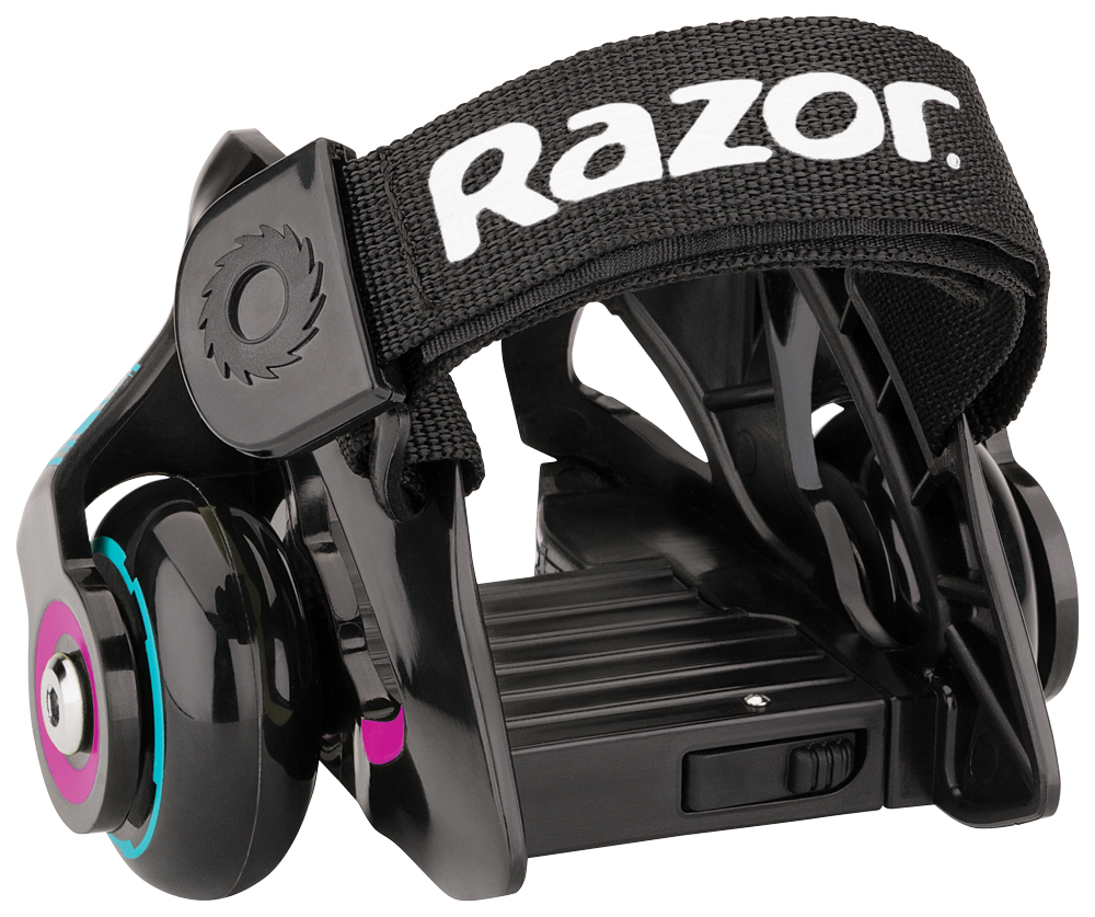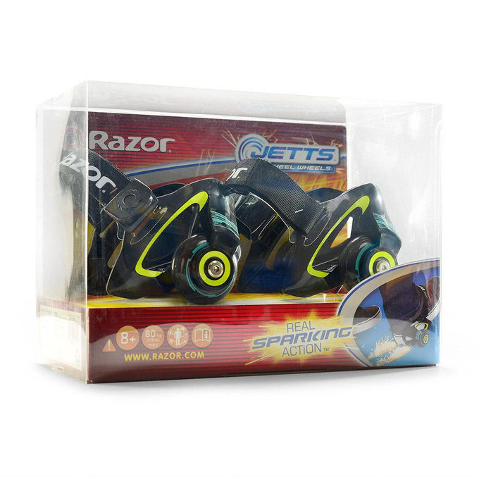 Ролики на обувь Razor Jetts (рейзер джетс) - специальное устройство, которое фиксируется на детскую или взрослую обувь и позволяет кататься, как на роликах. Такое устройство очень легкое, фиксируется быстро и надежно, а если "ролики" вам сейчас не нужны, их легко снять и убрать в сумку или рюкзак. Когда задняя часть платформы оказывается под прямым углом по отношению к поверхности дороги из роликов появляются искры. Это современный транспорт подарит ребенку ( и не только ребенку) возможность быстро и безопасно кататься в удобной для него обуви. Любые кроссовки превратятся в спортивный и быстрый транспорт.