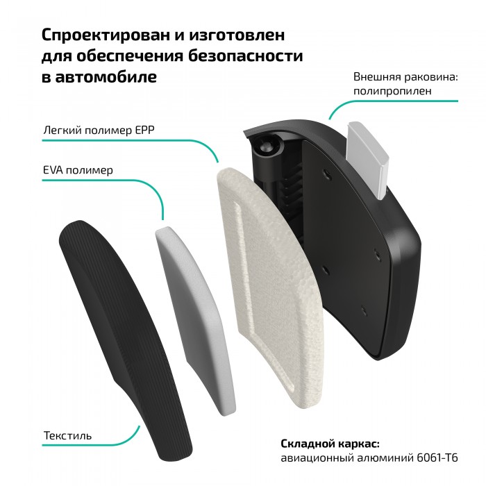 • Мягкий слой из вспененного материала обеспечивает комфорт • Пластичный слой отвечает за эффективное ударопоглощение за счет энергопоглощающего полимера • Жесткий слой – защитная раковина из крепкого полипропилена (PP) Кроме того, в подголовнике имеется дополнительный слой: Густой, с высокой плотностью пенный наполнитель с эффектом памяти (Memory Foam) для большего комфорта и демпфировании.