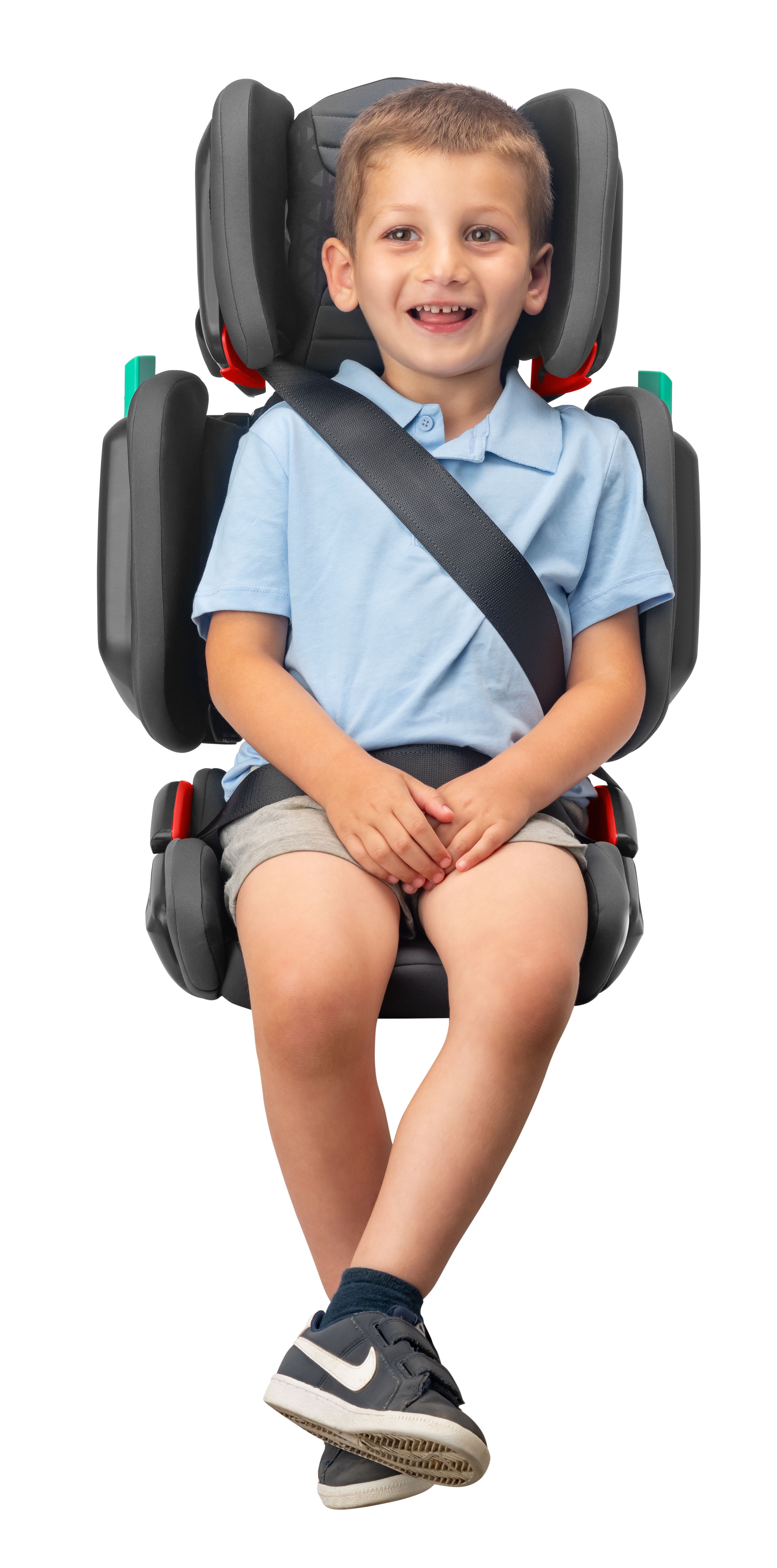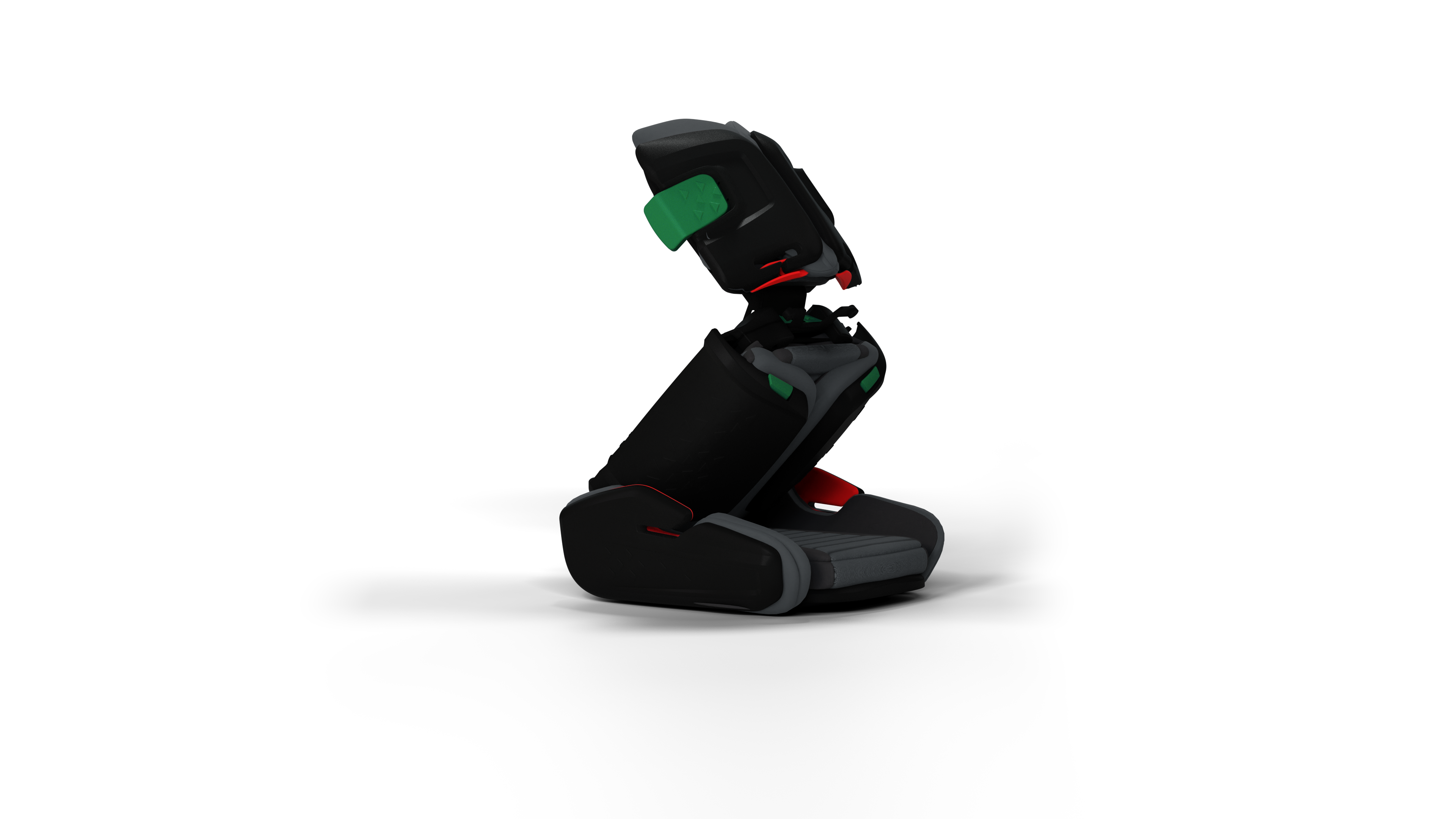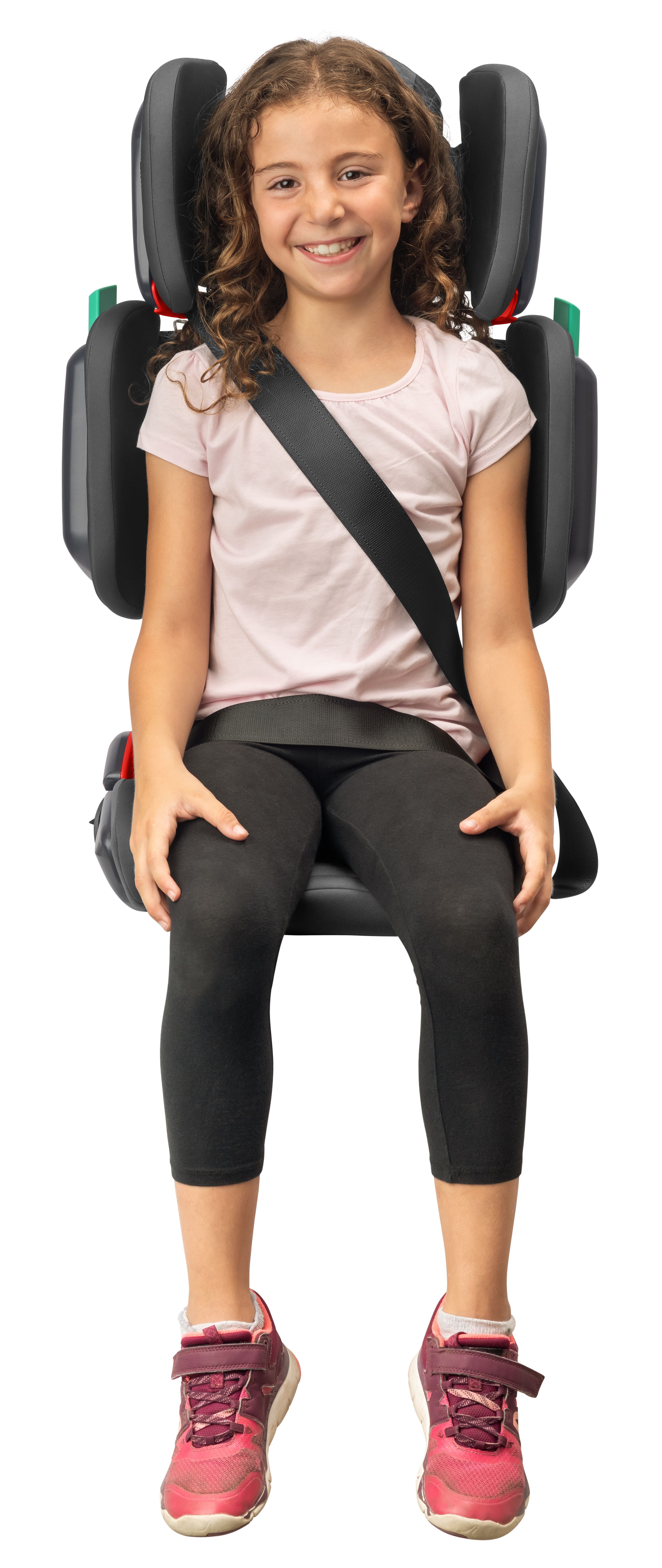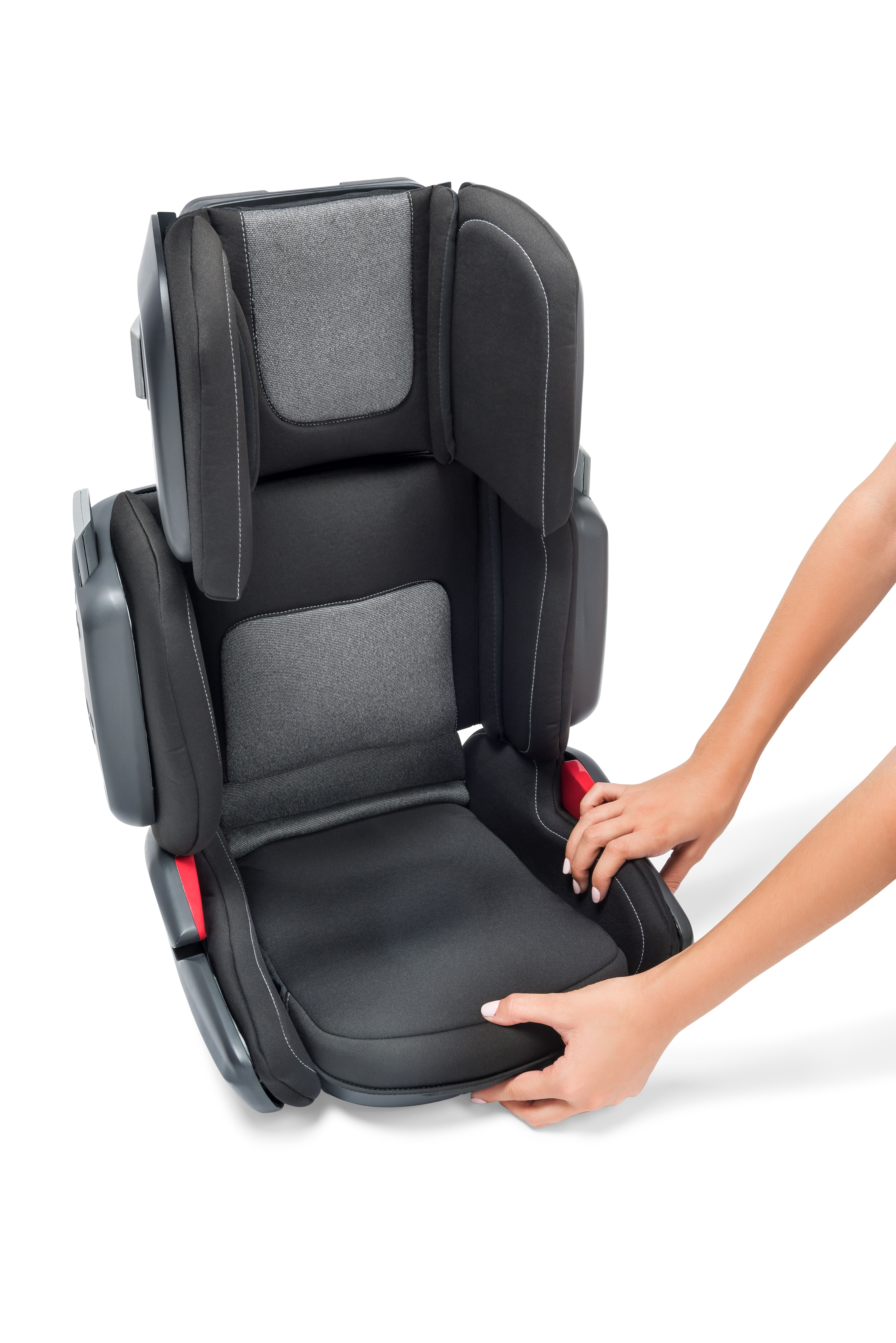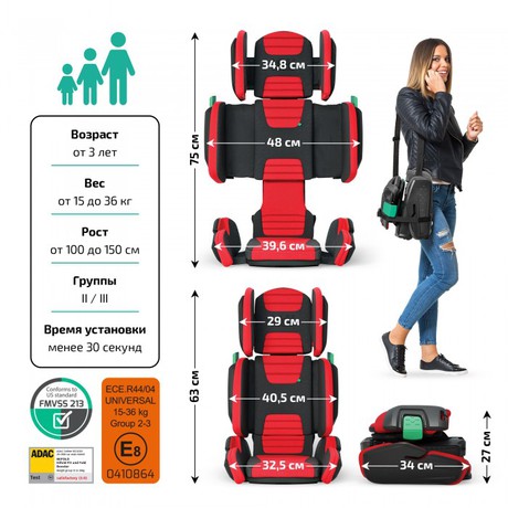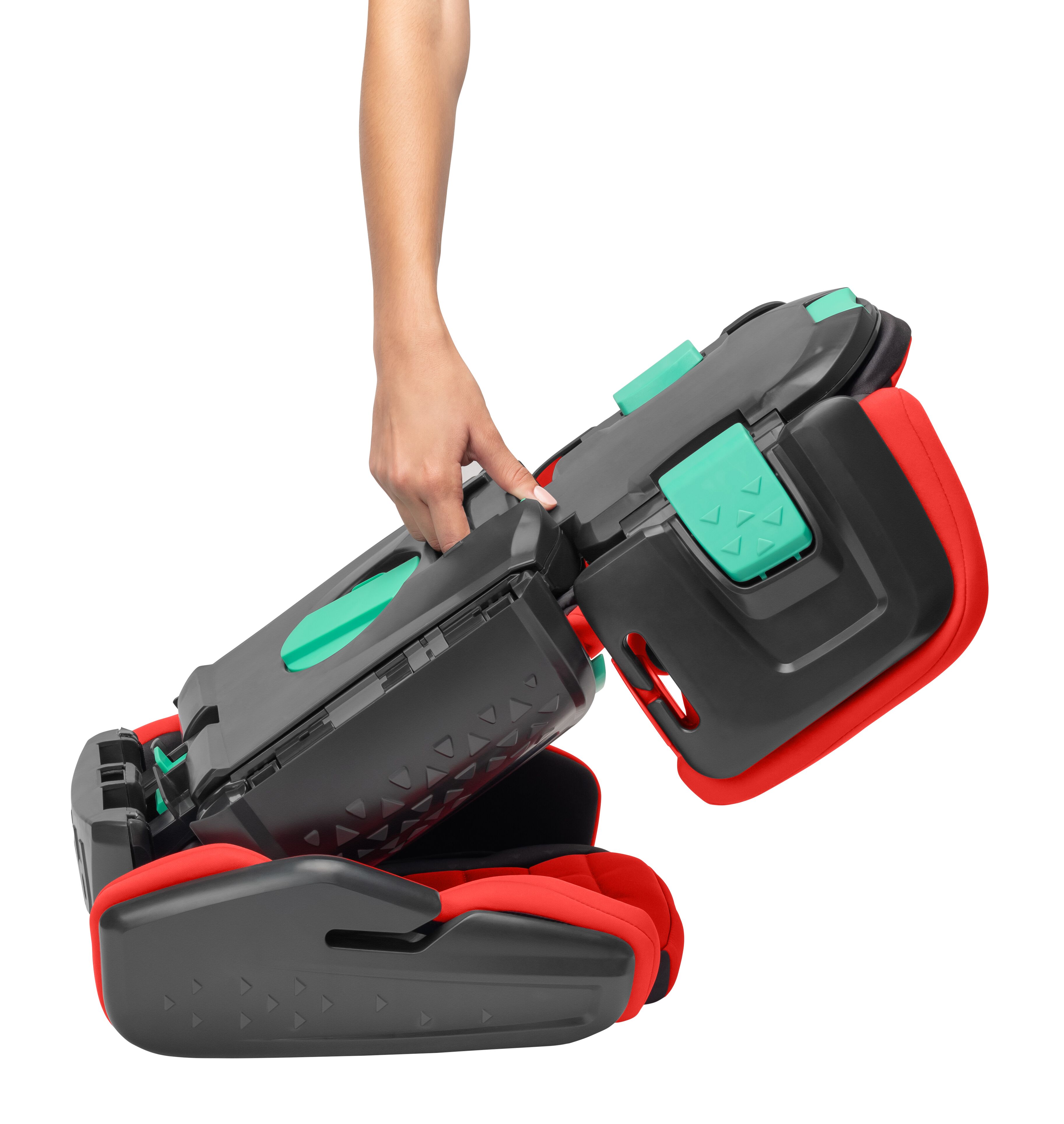 Установка или сложение кресла занимает буквально 3 секунды. В машине кресло устанавливается на любое сидение по ходу движения. Фиксирование осуществляется с помощью штатного ремня безопасности. Ребенок всегда фиксируется 3-х точечным штатным ремнем. Для обеспечения правильного положения ремня предусмотрена лямка с направляющей, обеспечивающая нужную высоту диагональной части ремня безопасности. Отсутствие подлокотников и форма корпуса исключают возможность ошибки при пристегивании. Спинка «плавающая», она наклоняется автоматически, повторяя положение спинки сиденья автомобиля.