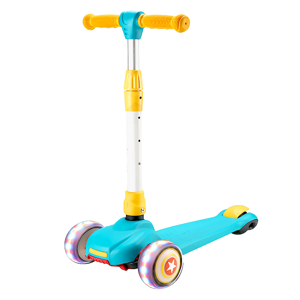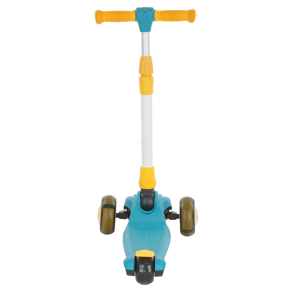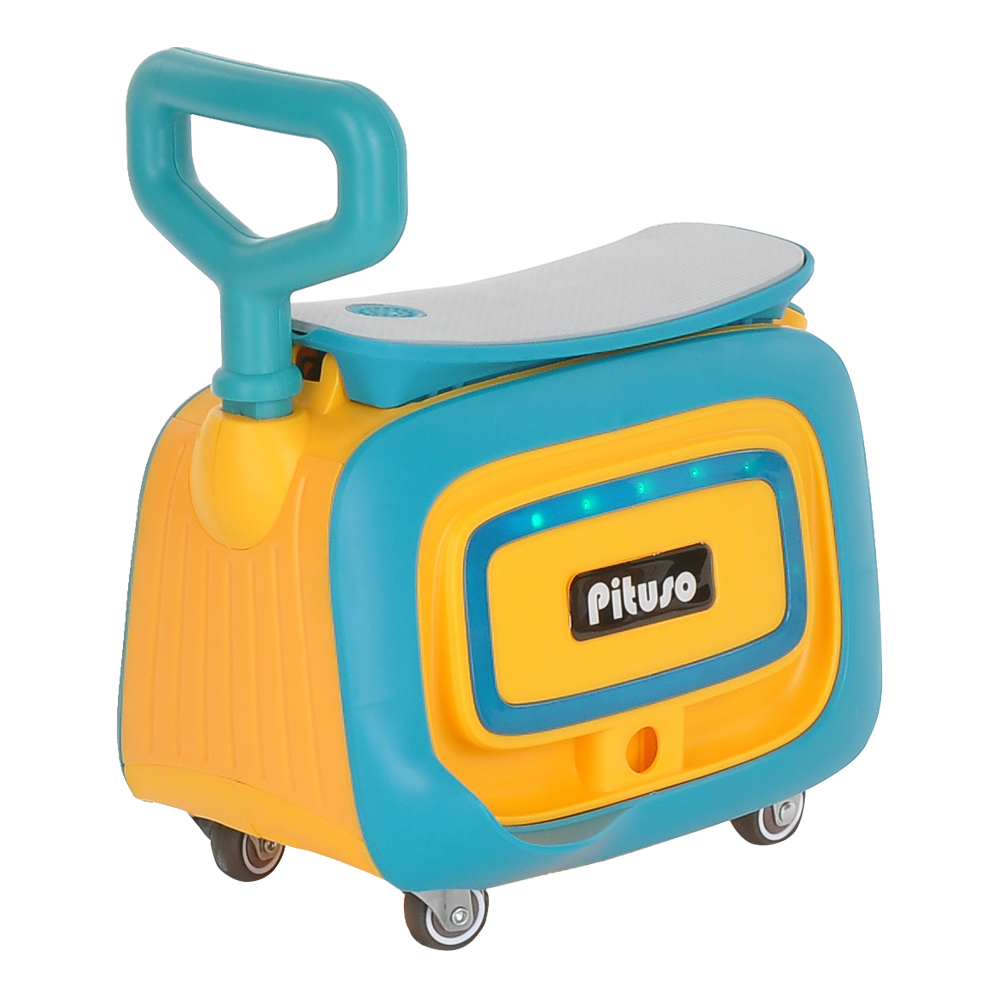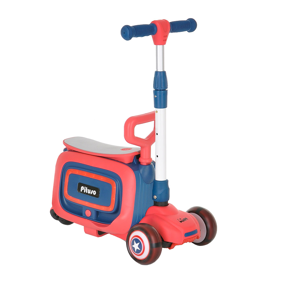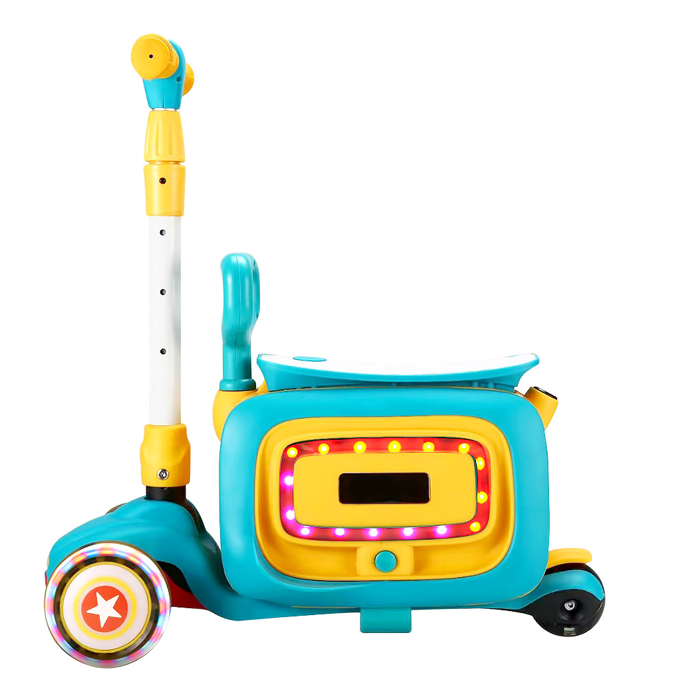 Самокат состоит из двух частей, которые можно использовать как вместе с самокатом, так и без. Вторая часть (сидение-чемоданчик) съемная и может использоваться отдельно, с помощью встроенных колес превращается в каталку. Под сиденье расположен удобный багажник куда ребенок может положить небольшие игрушки. Самокат оснащен различными мелодиями (на английском языке), колеса самоката светятся, а каталка имеет разноцветную подсветку.