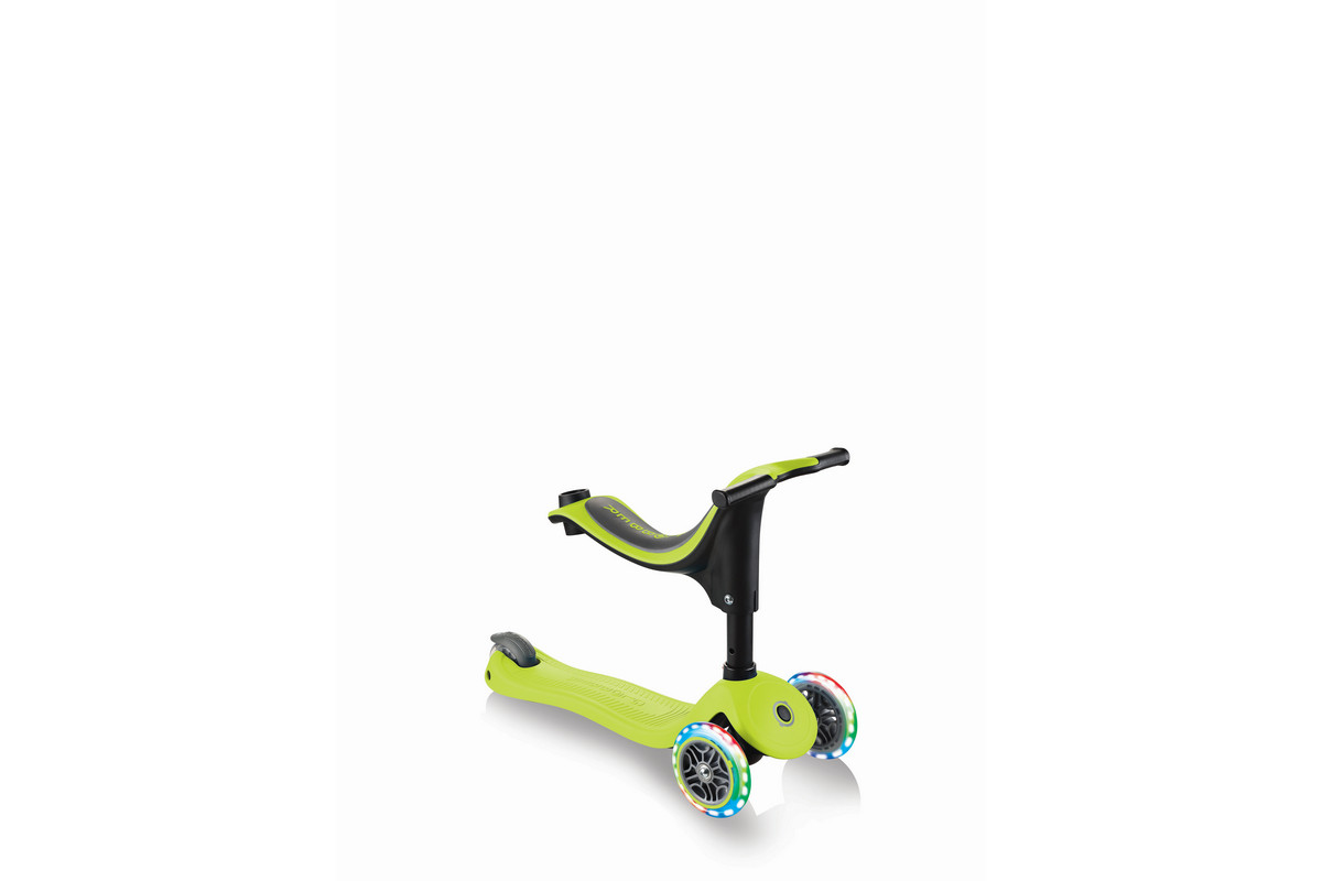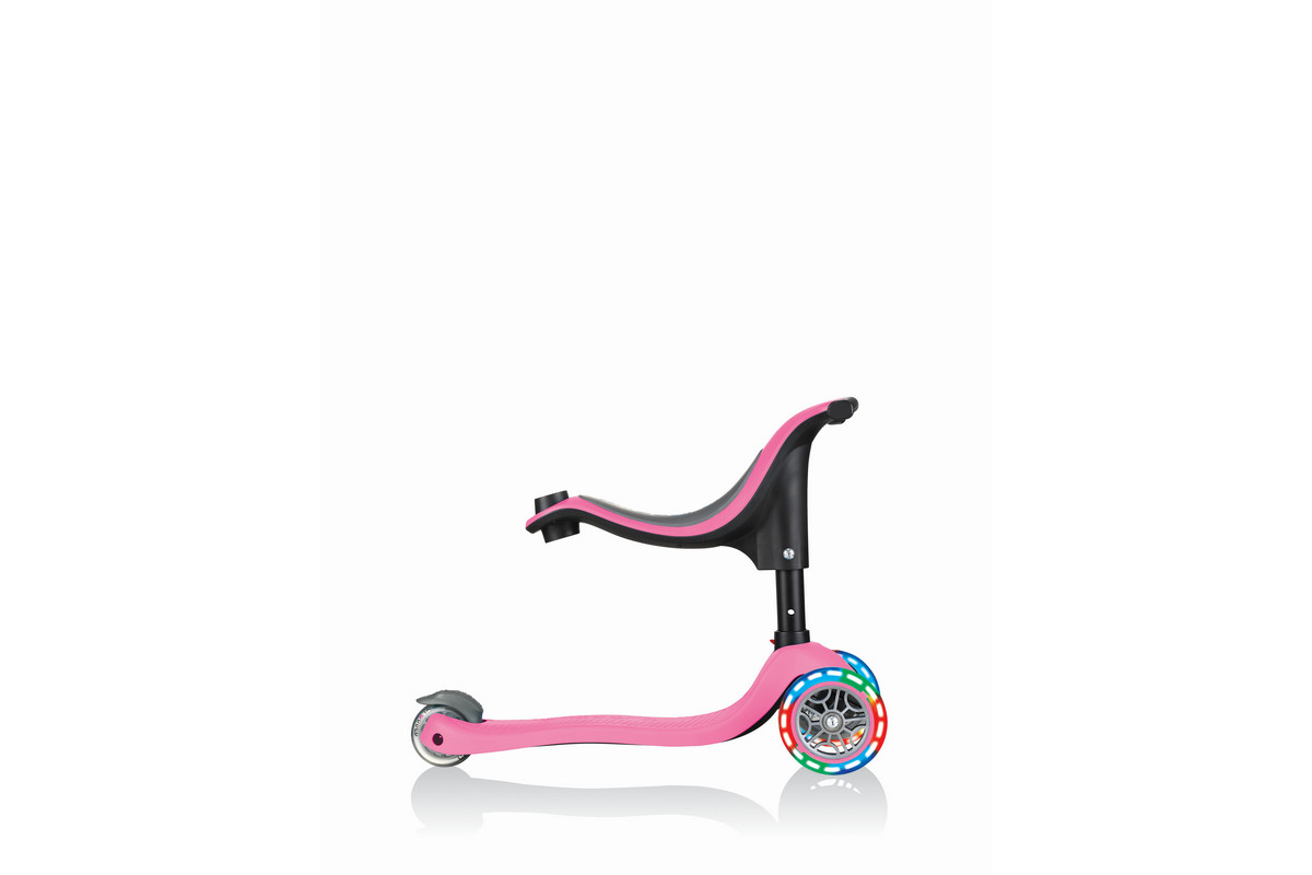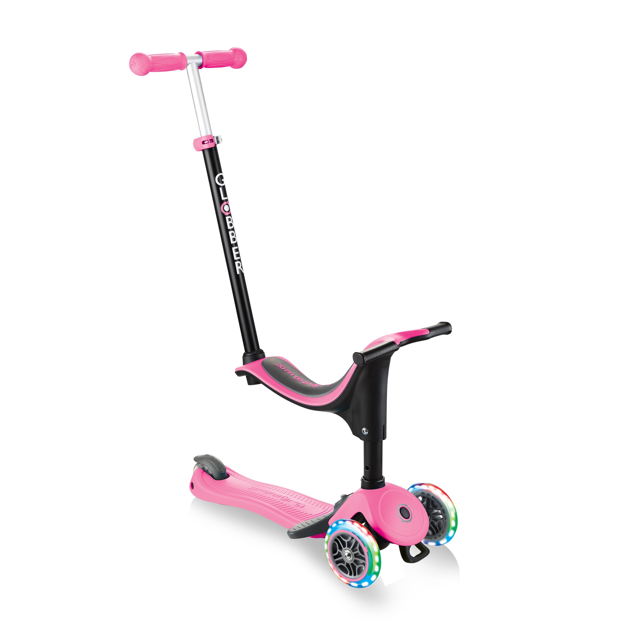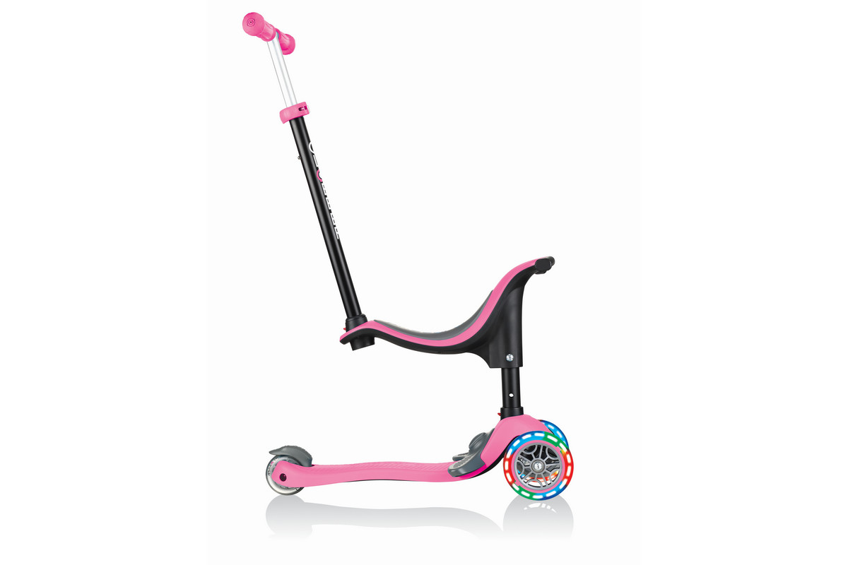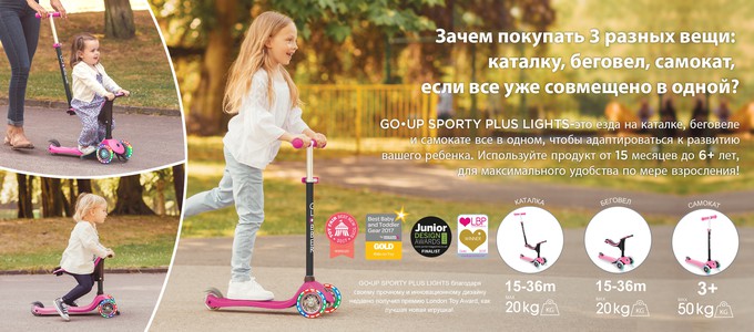 Самокат -беговел GLOBBER GO UP SPORTY PLUS LIGHTS (Глоббер гоу ап спорти плюс лайт) - красивый, яркий , функциональный самокат для ребенка от 1 года до примерно 6-9 лет. Максимальная нагрузка на сидение 20 кг, что соответствует примерно 4-5 лет, сам самокат выдерживает нагрузку до 50 кг. Самокат имеет детское сидение с ручкой управления, благодаря чему данный транспорт можно использовать как каталку. В дальнейшем ребенок может использовать данный транспорт как беговел. Для детей от 3-х лет сидение убирается и у ребенка будет полноценный удобный самокат со светящимися колесами.