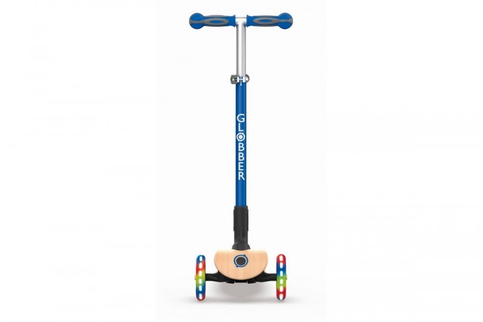 Самокат Globber Primo Foldable Wood Lights (глоббер примо вуд) - уникальная серия самокатов для ребенка от 3 до 6 лет с деревянной декой. Дека (платформа для ног) легкая и прочная, выполнена из 7-ми слоев дерева, с нескользящим покрытием и ребристой лазерной гравировкой по краям. Такой самокат смотрится очень эффектно и запоминающе. Стильный руль регулируется по высоте, позволяя настроить самокат под рост ребенка. Самокат имеет уникальную систему сложения: одним нажатием кнопки руль складывается к деке. Самокат удобен для хранения, поездок на машине, путешествий. Ребенок сможет самостоятельно катить свой сложенный самокат за собой. Для безопасности самокат имеет широкий надежный, ножной тормоз. Управляется самокат наклонами. При движении передние колеса светятся, что обезопасит маленького гонщика в темное время суток.