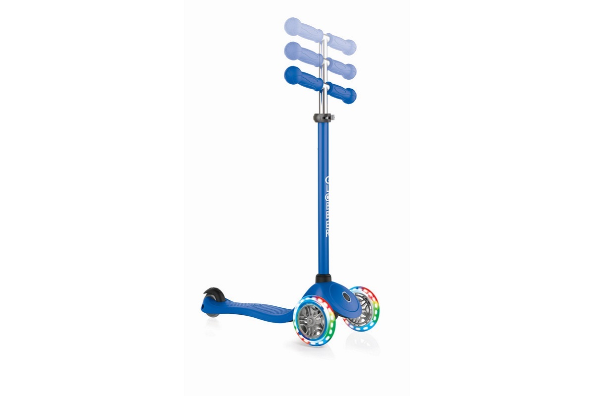 Самокат GLOBBER PRIMO LIGHTS (Глоббер примо лайтс) - детский, устойчивый трехколесный самокат для ребенка от двух лет и ростом от 90 см, который только учится кататься. Он оборудован инновационной системой блокировки рулевого управления. Эта модель обновлённая, улучшенная версия знаменитой серии Primo. Самокат Primo Lights имеет большой диапазон регулировки руля — от 67,5 до 77,5 см. Помимо оригинального дизайна полностью безопасен. Он имеет: