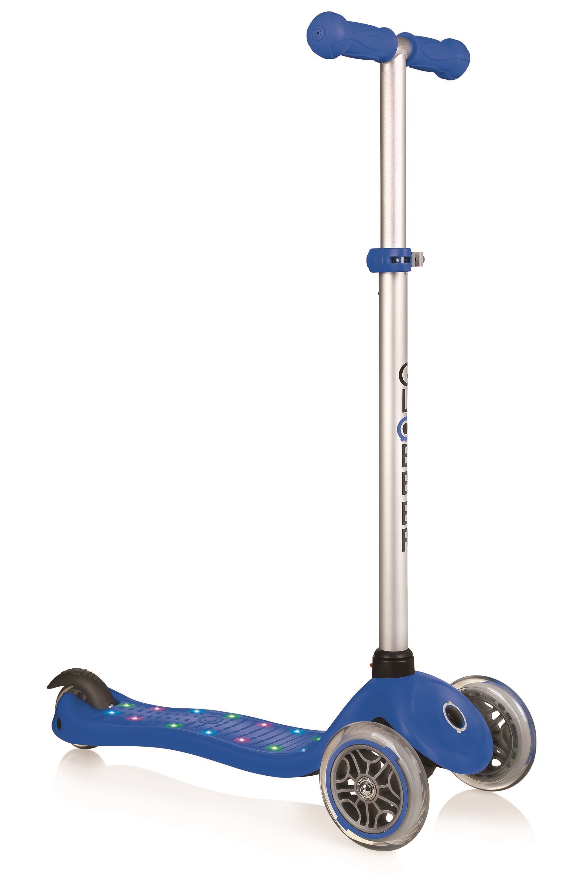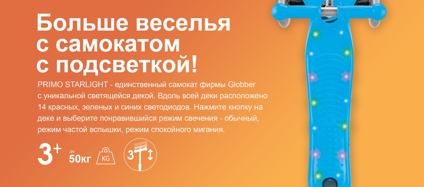 Самокат GLOBBER PRIMO STARLIGHT (Глоббер примо старлайт) - трехколесный детский самокат с красивой подсветкой платформы. Светодиоды в платформе имеют 3 цвета: синий, красный и зеленый. Платформа имеет 3 режима горения и заряжается с помощью micro USB. Для удобства ребенка руль регулируется по высоте. Этот самокат станет отличным транспортом для летней прогулки с ребенком.