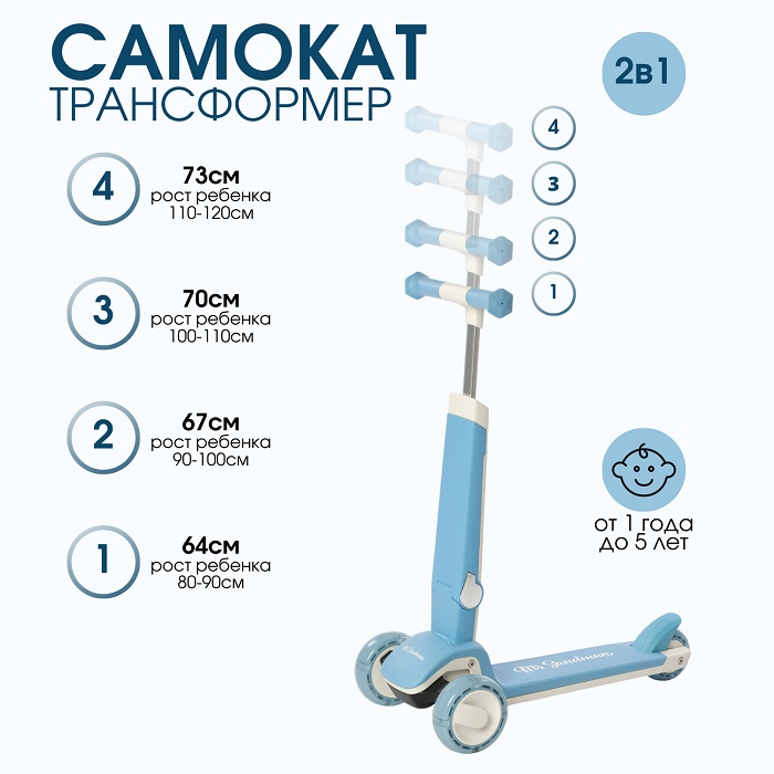 Уникальная конструкция позволяет превратить самокат в каталку и наоборот за считанные секунды. Вы сможете отправиться гулять на самокате, но когда ножки у ребенка устанут, превратить самокат в каталку или беговел с сидением. При этом сидение выдерживает максимальную нагрузку до 20 кг, примерно до 3-4 лет, а сам самокат выдерживает нагрузку до 50 кг. Благодаря складной конструкции самоката его легко взять на любую прогулку, можно убрать в корзину коляски, взять в гости или путешествие.