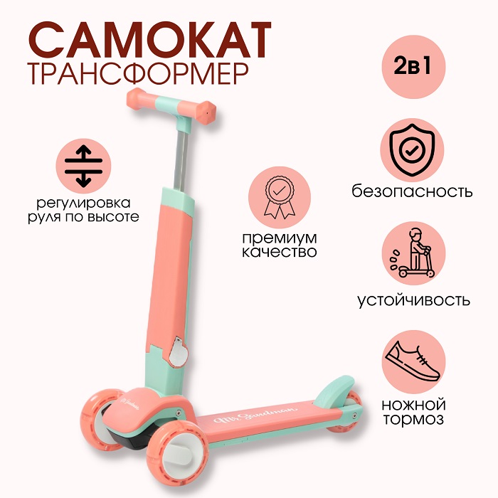 Самокат сделан исключительно из качественных материалов, поэтому прослужит долго, а телескопический руль позволяет скорректировать высоту в зависимости от роста ребёнка. В самокате используются настоящие профессиональные подшипники гоночного уровня. Яркие цвета и светящиеся колёса делают модель интересной и привлекательной для детей, а так же повышают безопасность в вечернее время суток.