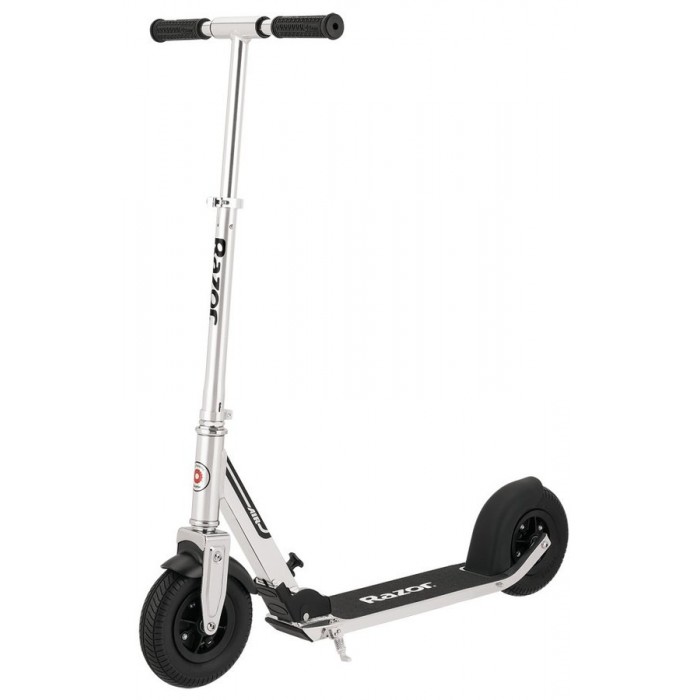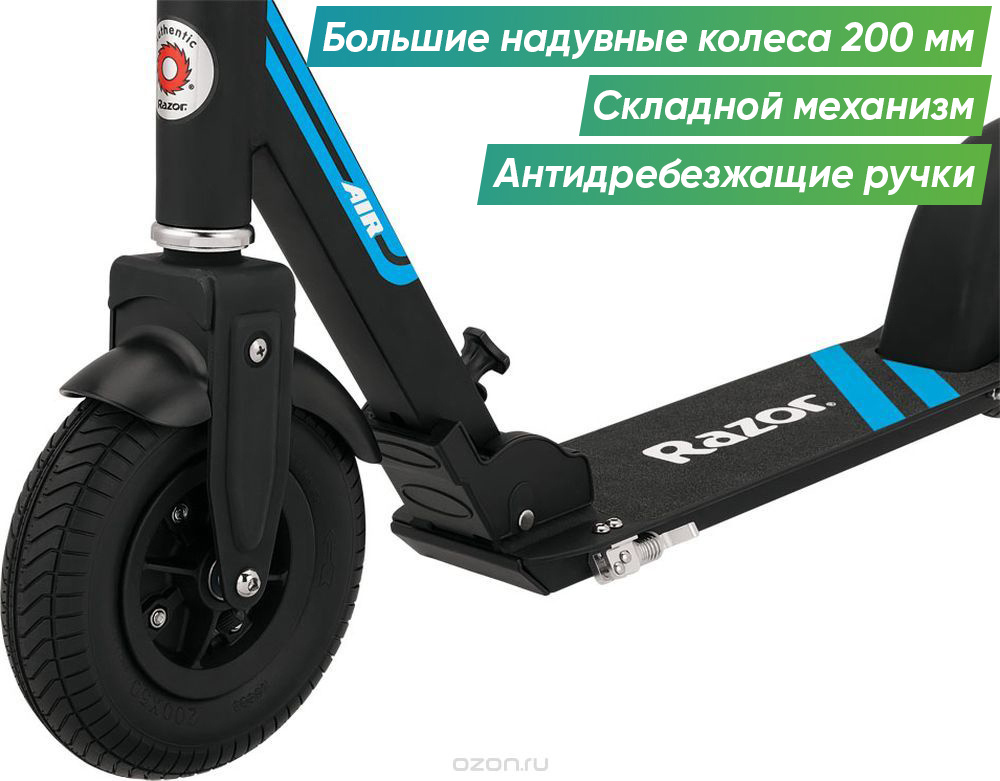 Самокат с надувными колёсами Razor A5 Air (рейзор а5 аир) - самокат для детей от 8 лет и взорослых, который справится с любым бездорожьем. Большие надувные колеса высокого давления и бесшумная амортизация смягчат любые неровности дороги и делают поездку очень плавной. Теперь не надо выбирать дорогу "по лучше", можно ехать так, как нравится, прокладывая новые пути.