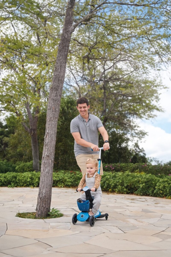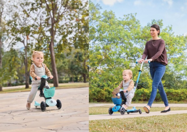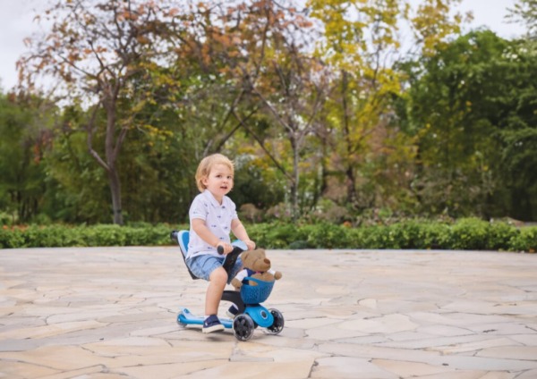 Этот самокат с сиденьем оснащен дополнительными функциями, которые превращают удовольствие в функциональность: запатентованный модуль заднего колеса для поворота на 360° родителями, удобная спинка и съемная мягкая корзина.