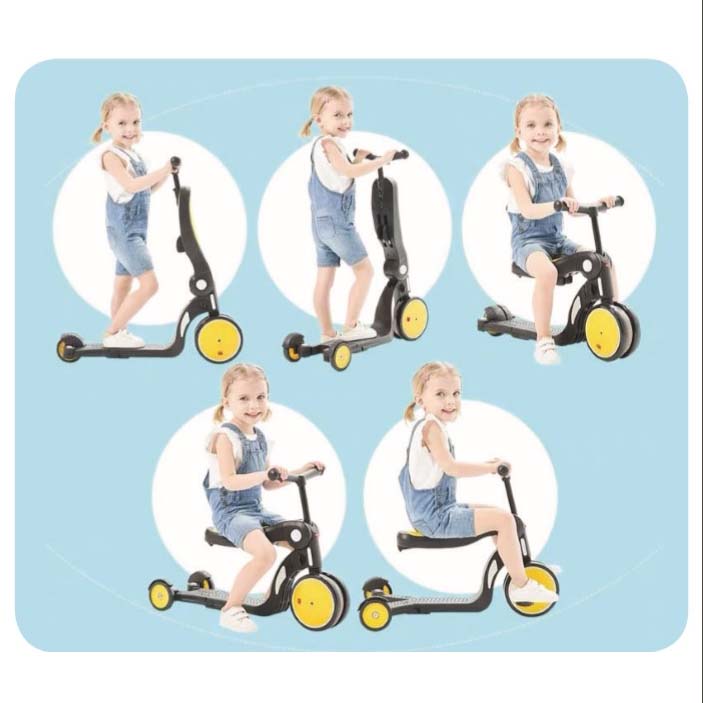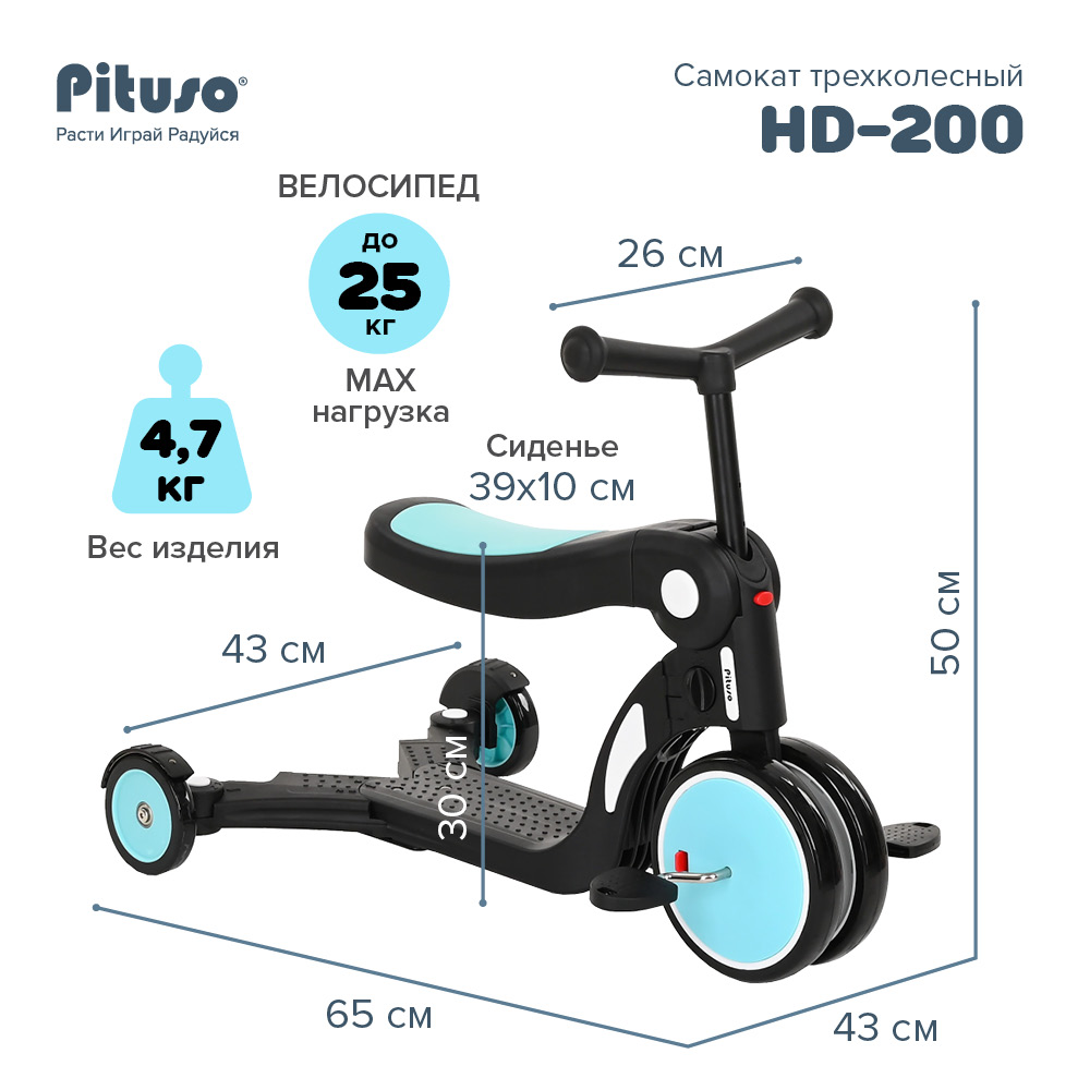 Самокат-трансформер PITUSO HD-200 5в1 - уникальная модель, которая сочетает в себе сразу несколько видов транспортных средств для ребенка: самокат, беговел, велосипед. При этом модель может быть как с 3-мя колесами для большей устойчивости, так и с 2-мя. Модель легко трансформируется с одного вида на другой, без каких либо инструментов.