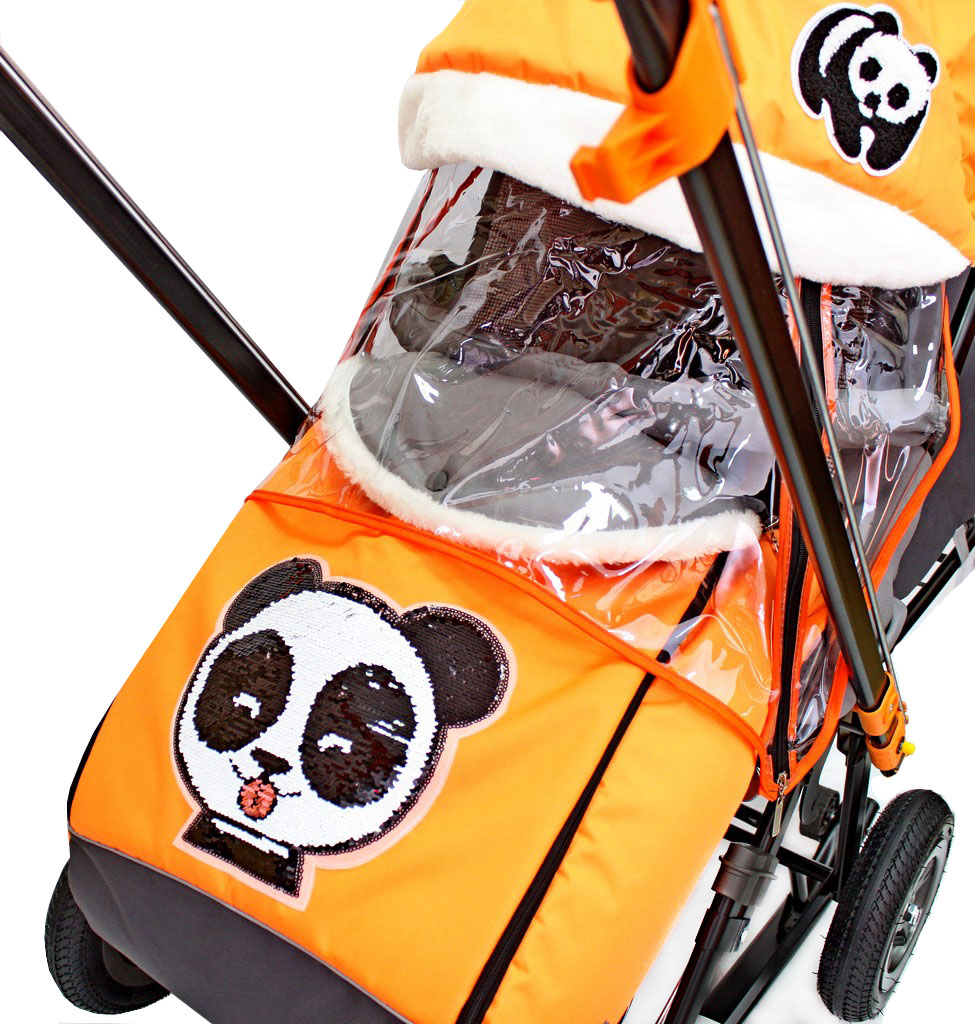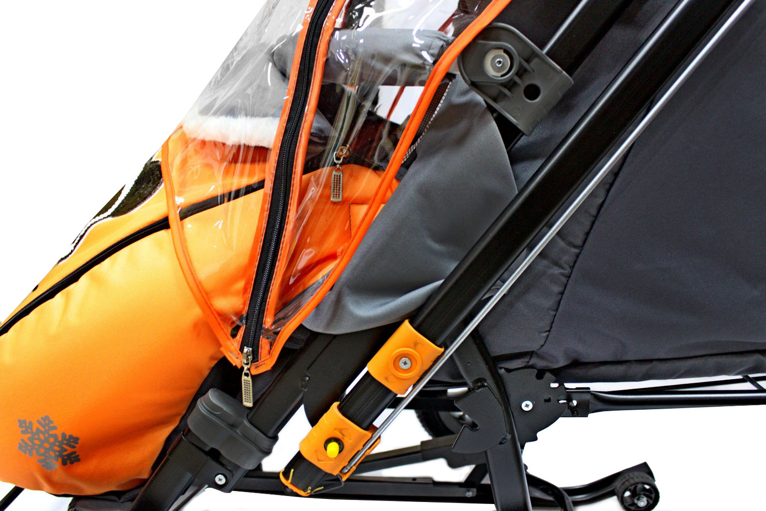 - Съемный прозрачный тент от ветра и дождя с двумя молниями, крепится к чехлу коляски на пуговицу для исключения продувания.