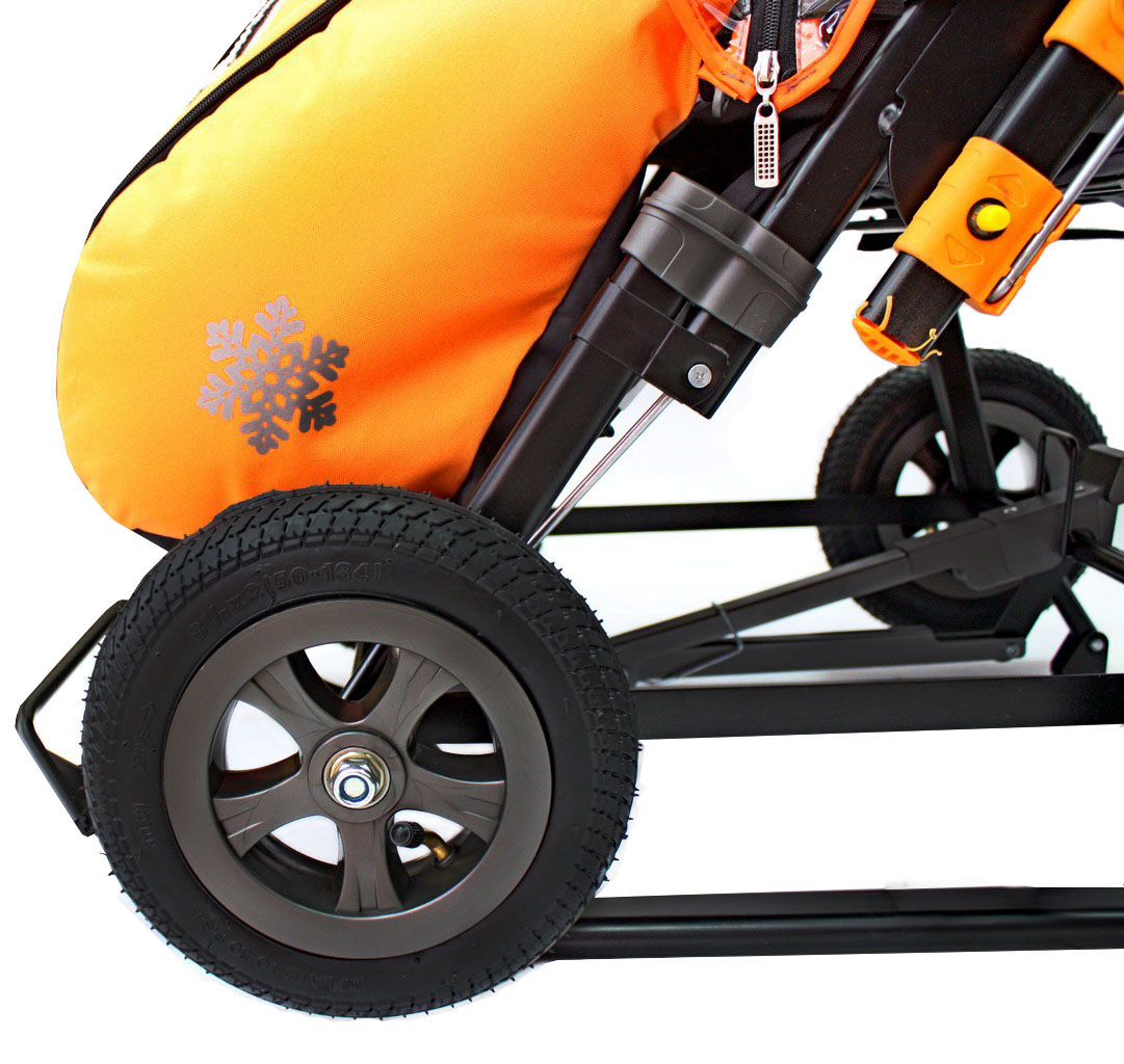 - 4 надувными колесами и очень надежный педальный механизм. Переход с колес на лыжи и наоборот простым нажатием ногой.